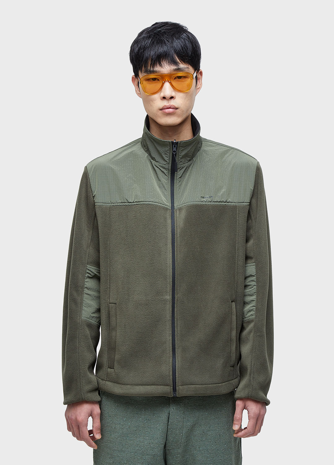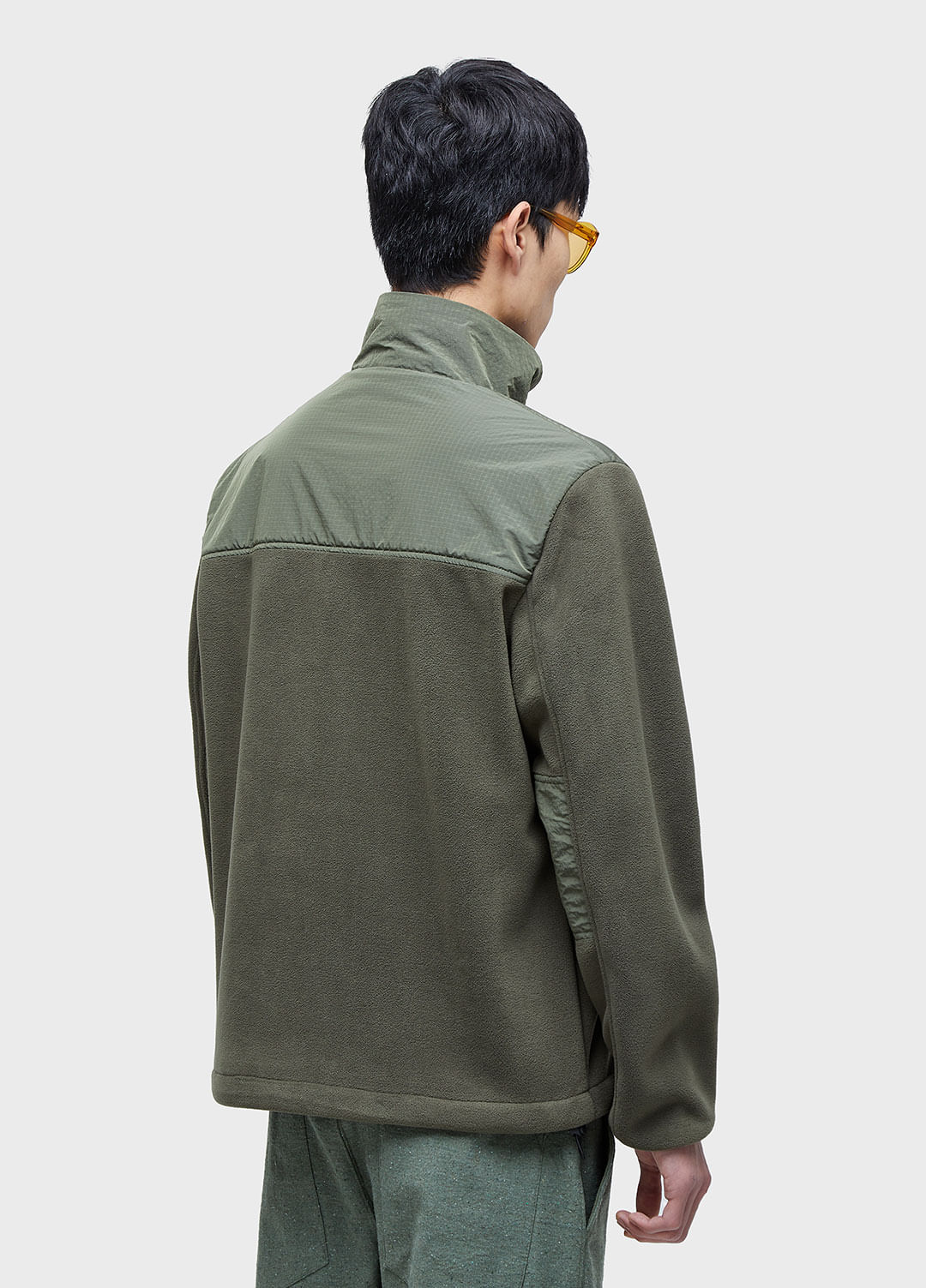 Jaqueta dupla face masculina com modelagem ajustada em fleece e nylon. A parte interna da peça possui as costuras fitadas.