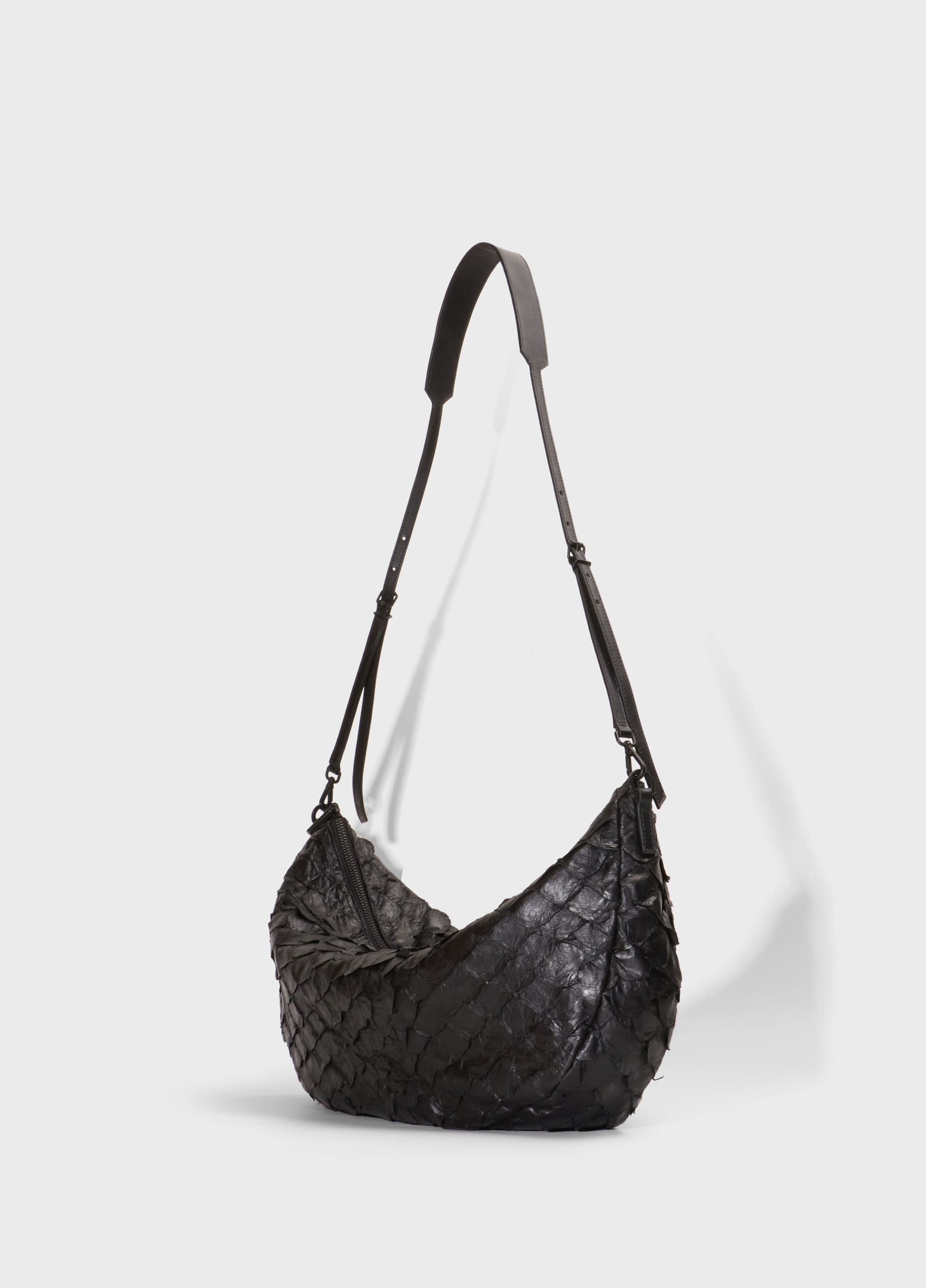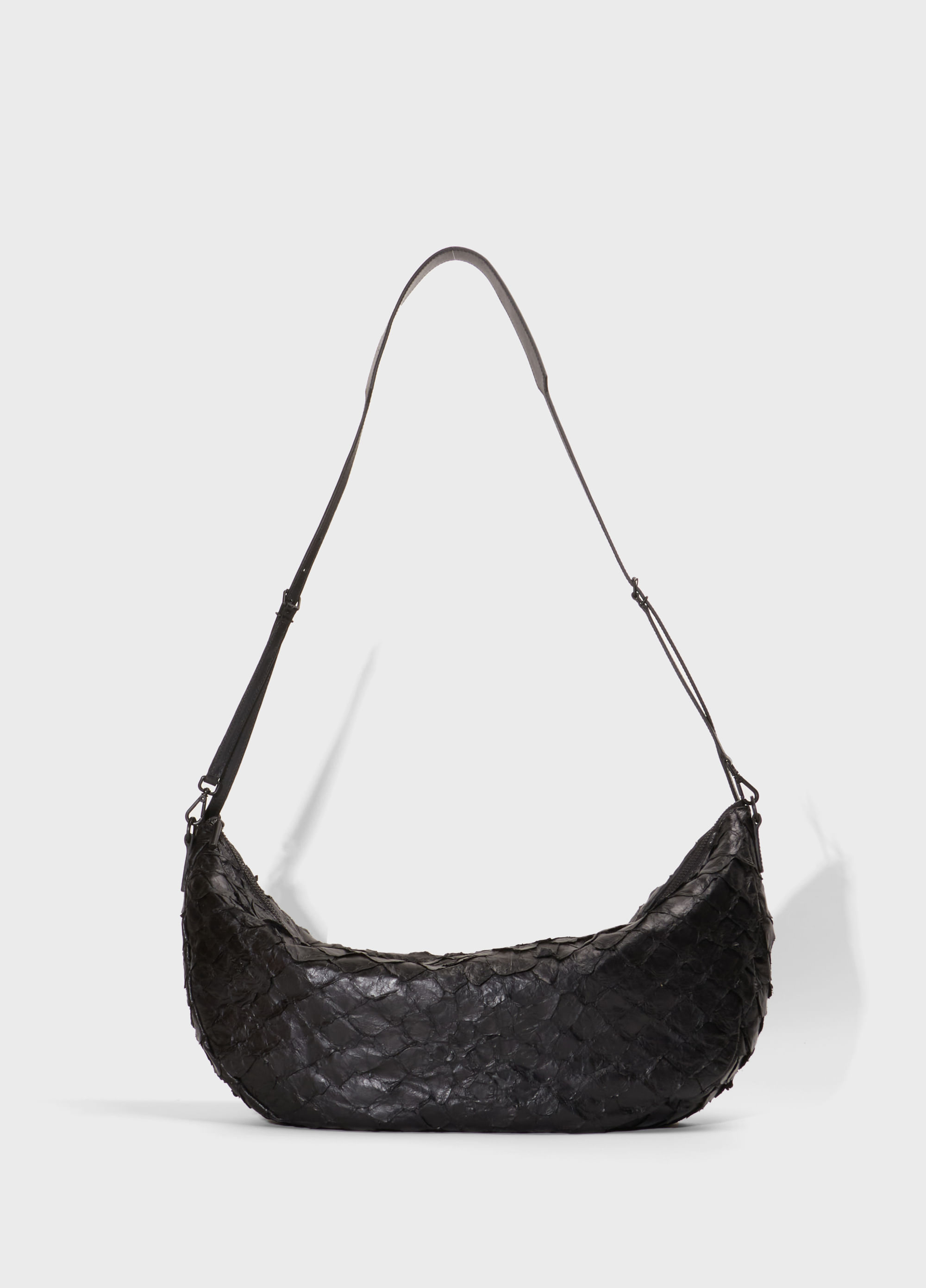 Bolsa em couro de pirarucu de tamanho médio, fechamento em zíper de metal, detalhes em couro bovino e forro em sarja 100% algodão. Para que esta peça tivesse um super caimento, utilizamos uma pele de pirarucu com um novo tipo de acabamento, mais macio e suave. A alça possui regulagem para uso no ombro ou transpassada. A alça pode também ser retirada por completo e substituída pelas nossas alças vendidas separadamente. Tem 1 bolso interno com fechamento em zíper de metal. Metais personalizados Osklen. A sofisticação da pele do pirarucu aliada ao shape moderno da peça faz um mix ideal para trazer inovação aos looks do dia a dia.