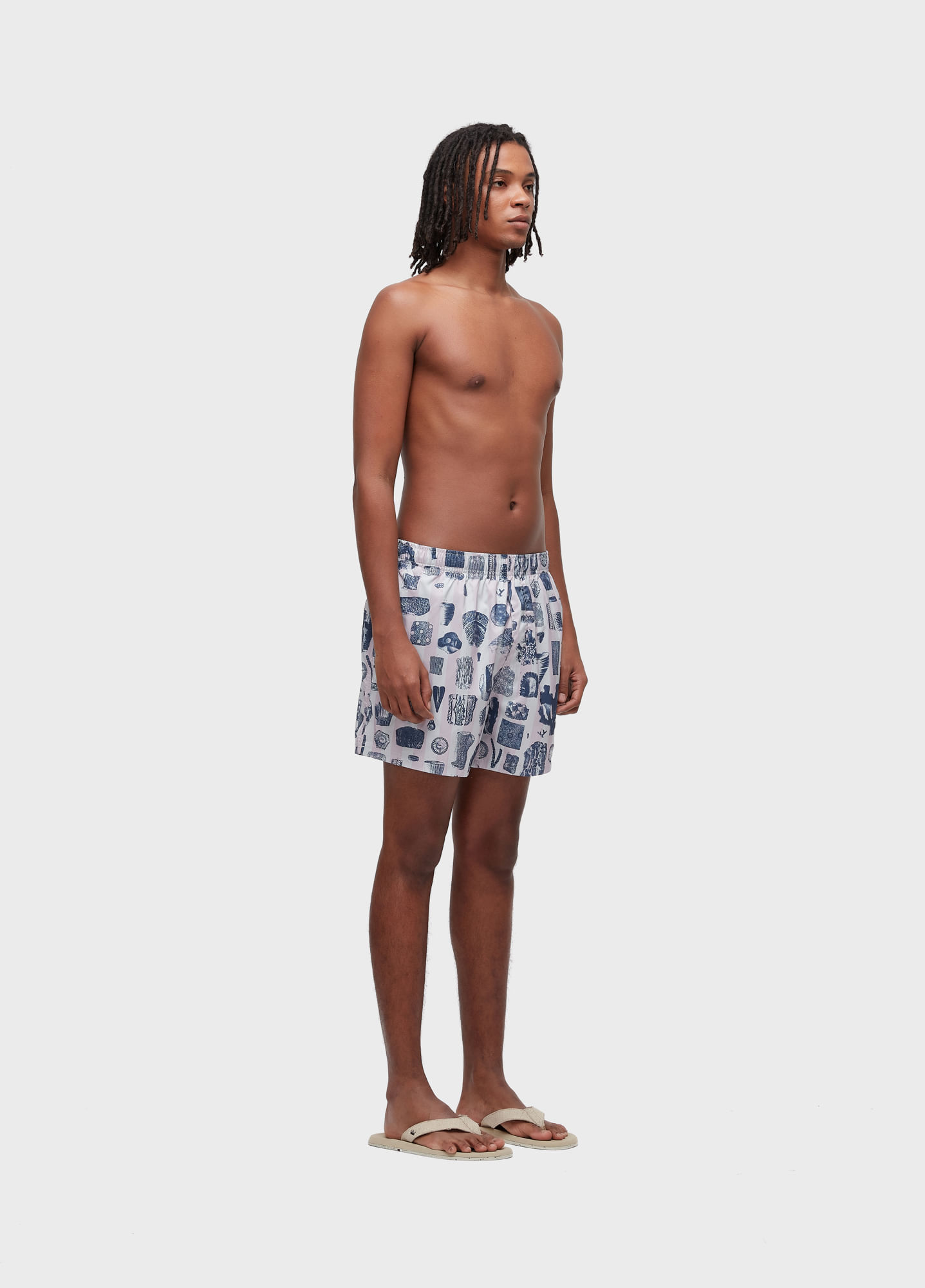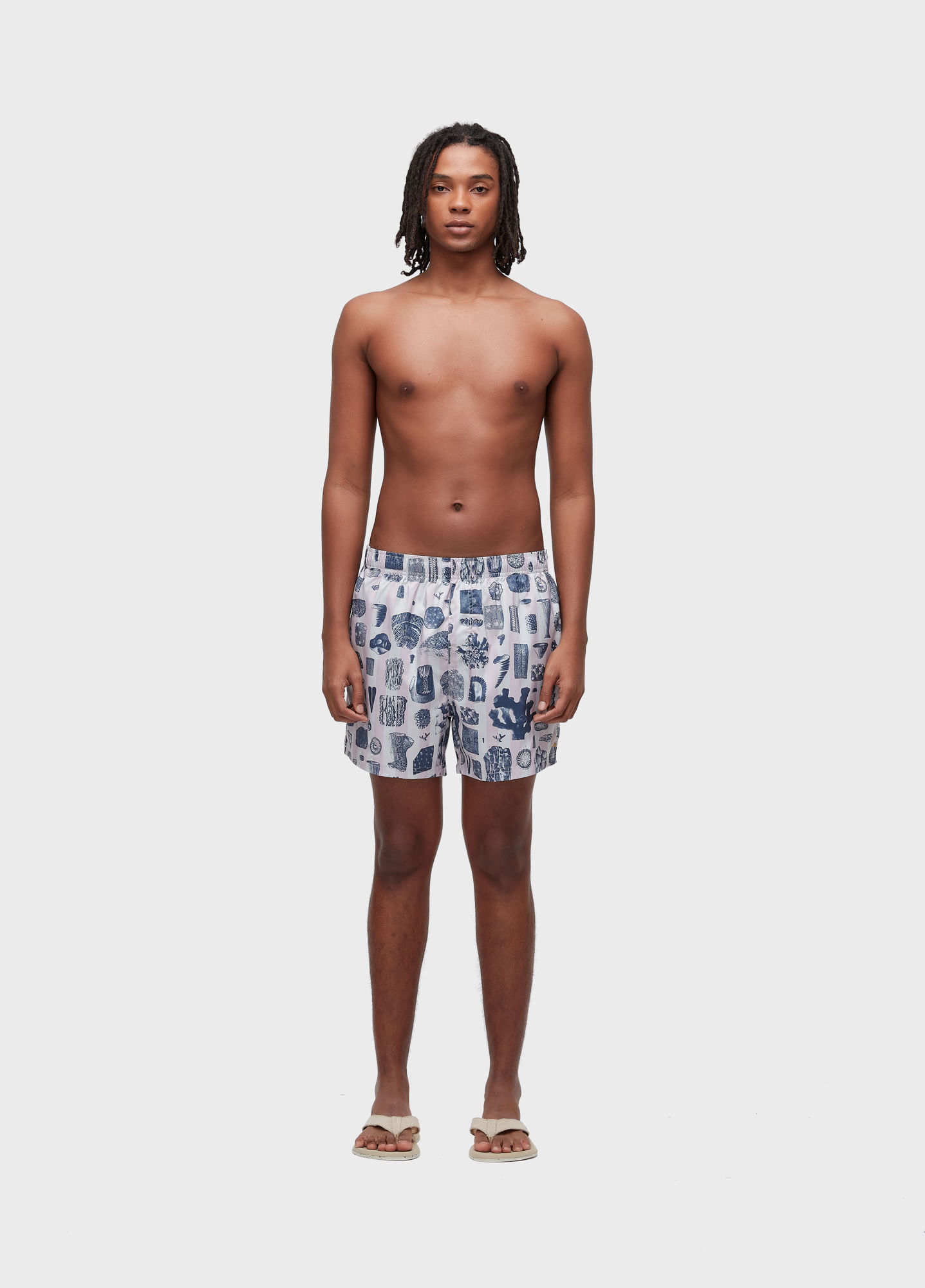 Short com cós de elástico masculino em tecido exclusivo Aquaone Flex. Modelagem Beach com lateral 15". Estampa Corais. Secagem Rápida. Redesign Waste.