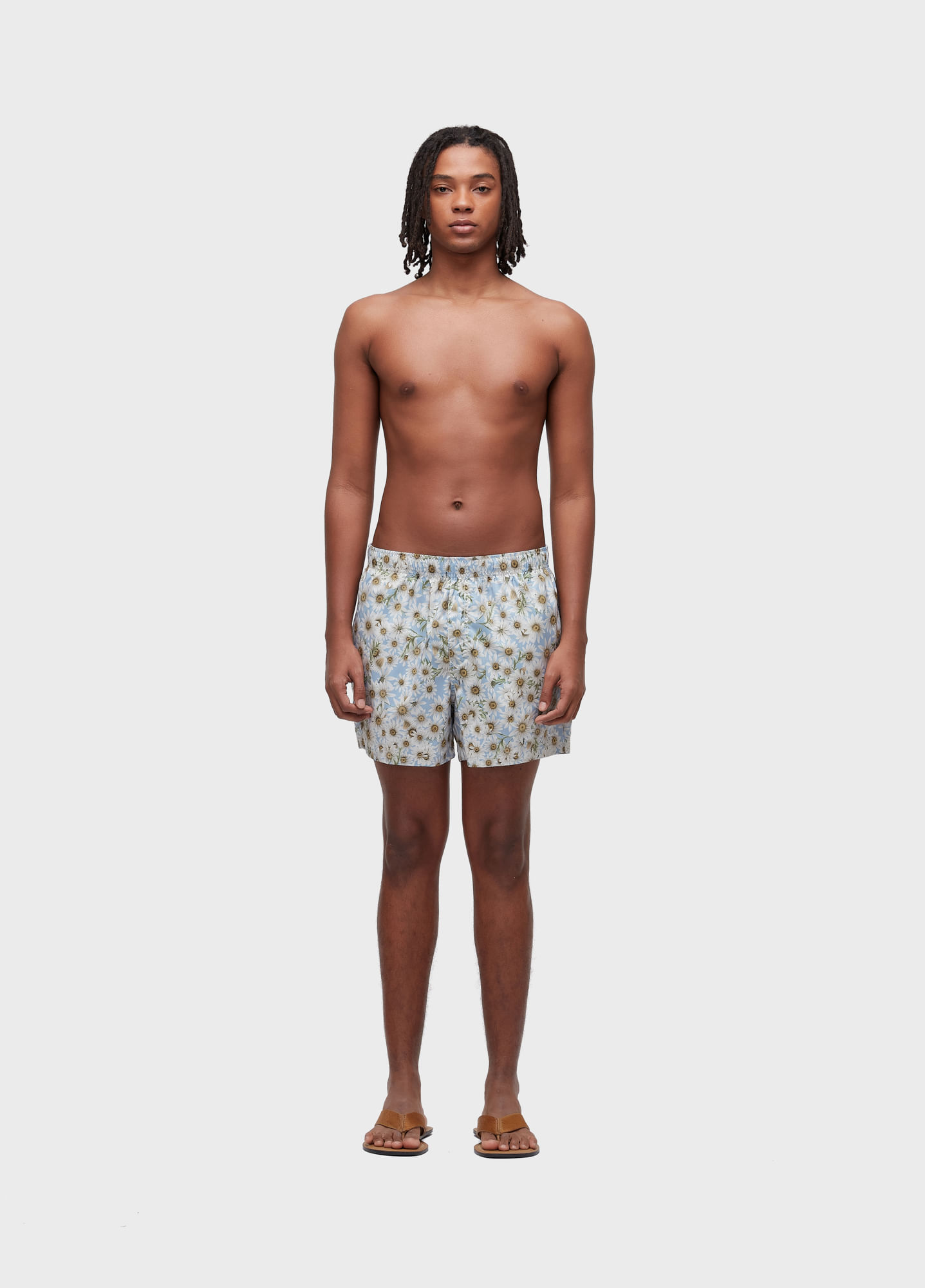 Short com cós de elástico masculino em tecido Aquaflex. Modelagem Beach com lateral 15". Estampa Margaridas. Secagem Rápida.