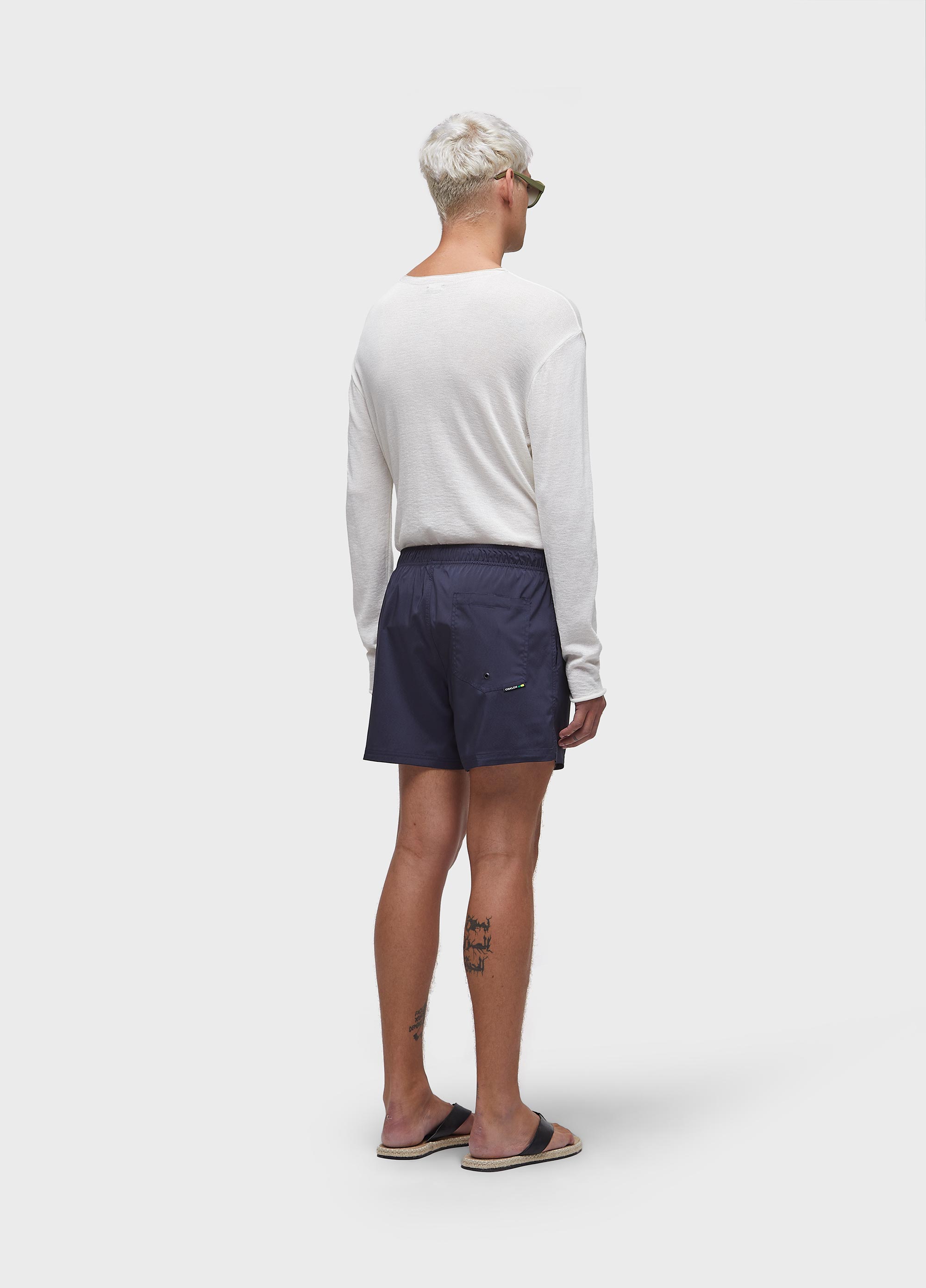Short com cós de elástico masculino em tecido Aquaone Flex. Modelagem Beach com lateral 15" Peça lisa com Fita Persoanlizada Osklen aplicada na lateral, Secagem Rápida. Redesign Waste.