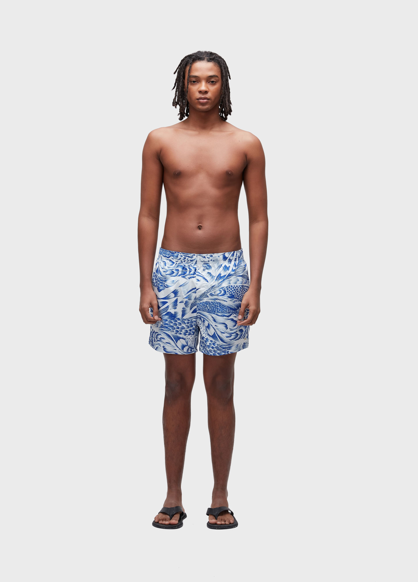 Short com cós de elástico masculino em tecido exclusivo Aquaone Flex. Modelagem Beach com lateral 15". Estampa Pirarucu. Secagem Rápida. Redesign Waste.