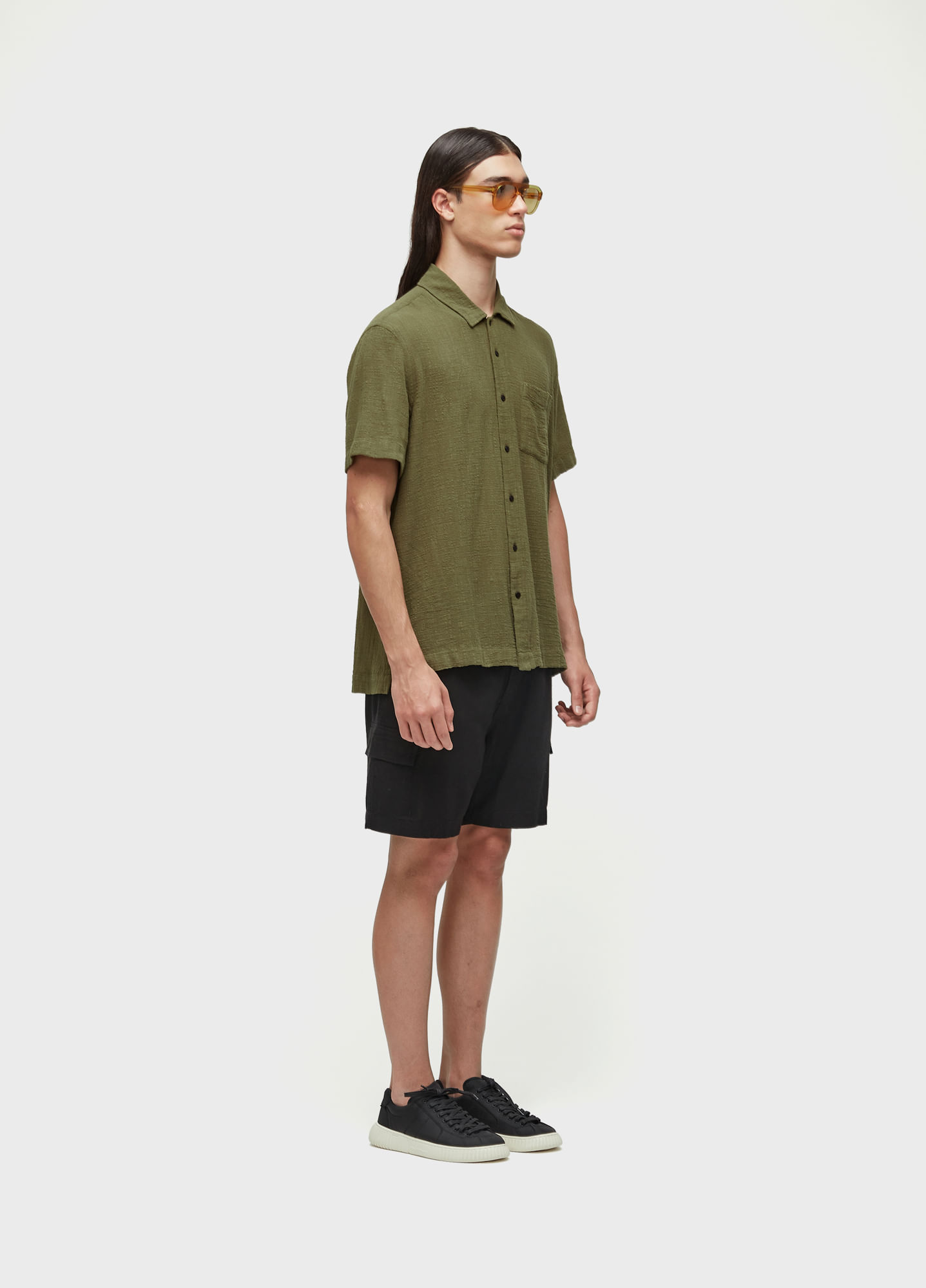 Bermuda masculina tipo cargo feito com tecido de linho com viscose. Possui bolsos cargo e faca nas laterais e bolsos embutios nas costas. Peça lavada e amaciada.
