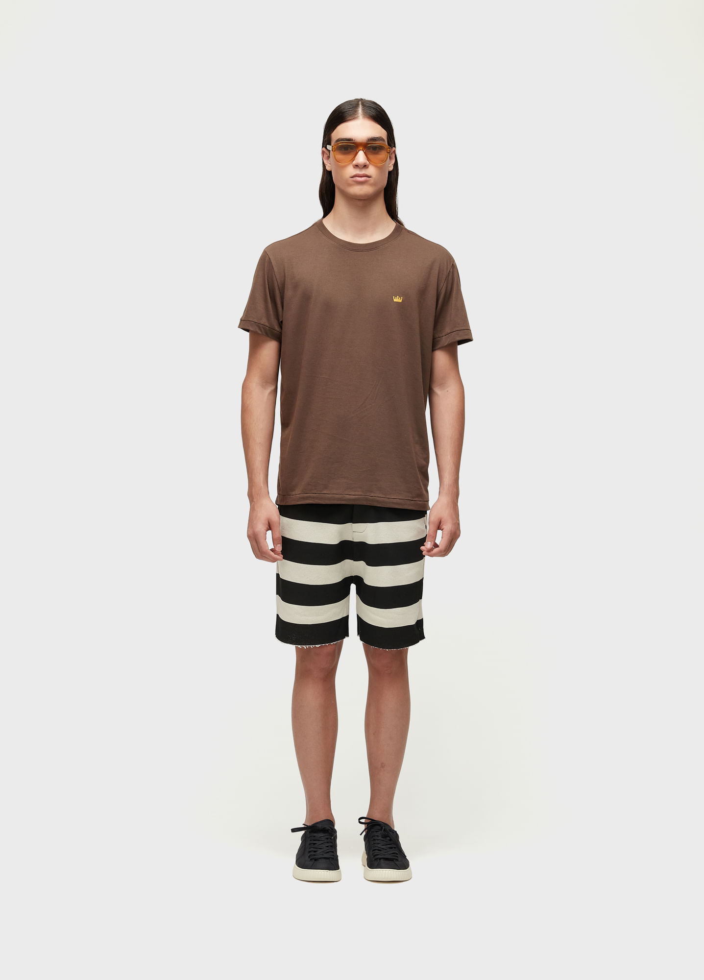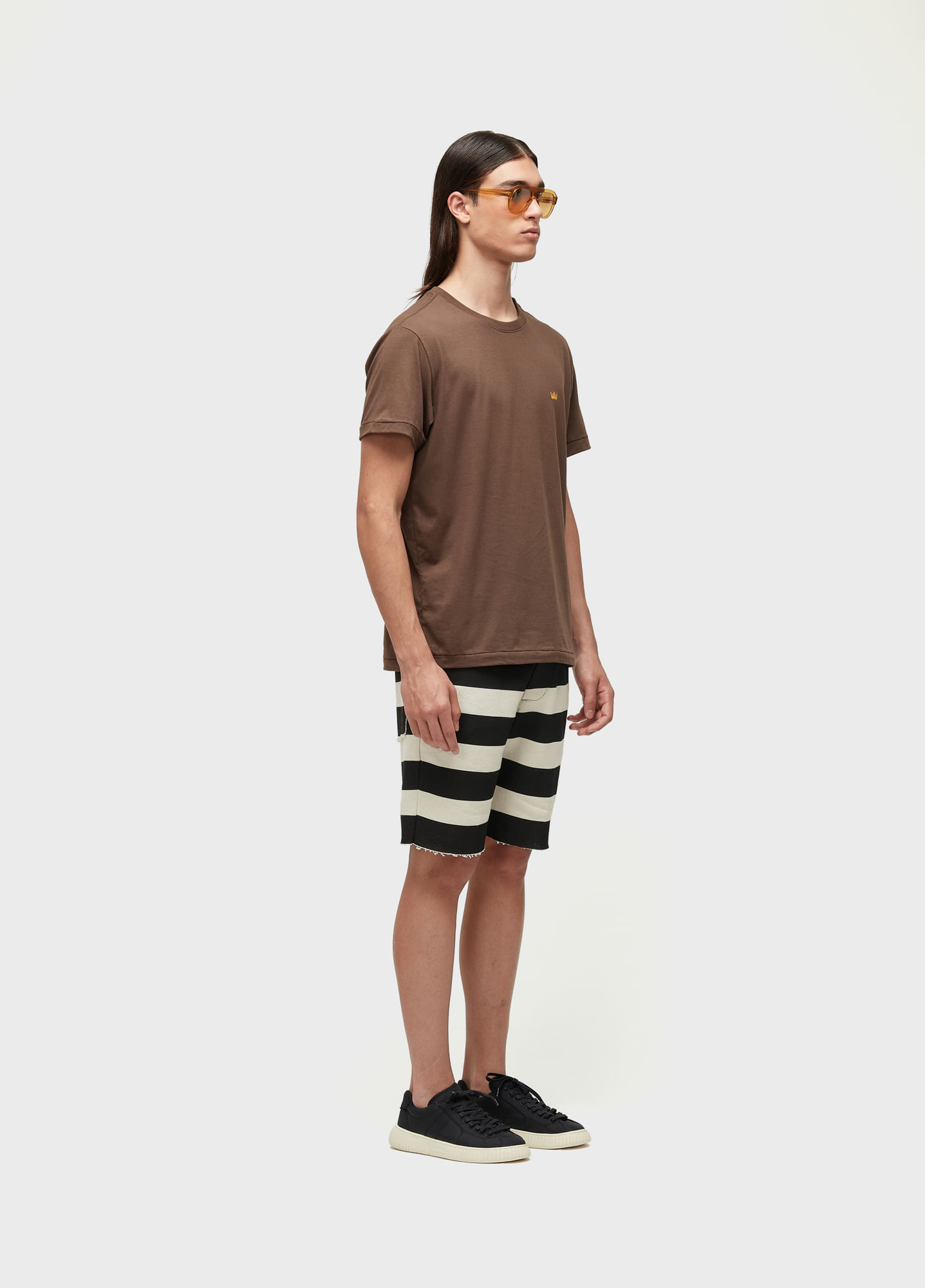Bermuda masculina feita em E-Fabric. Peça produzida com algodão reciclado, matéria-prima criada a partir do reaproveitamento de resíduo têxteis, processo que reduz os resíduos têxteis. Bandeira: Redesign Waste.