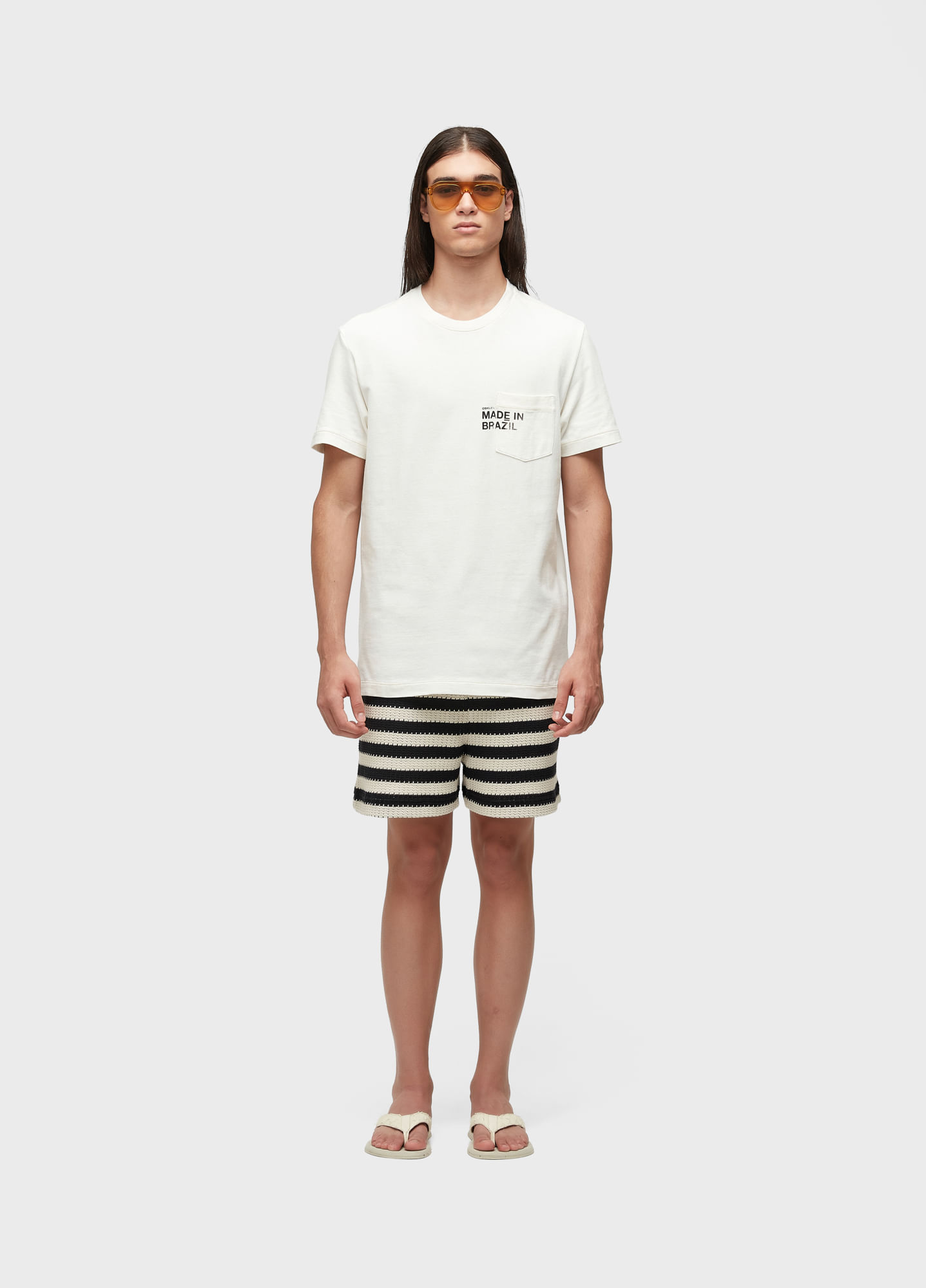 Bermuda masculina produzida em malha com aspecto de tricot, 68% Viscose 32% algodão. Modelagem over.