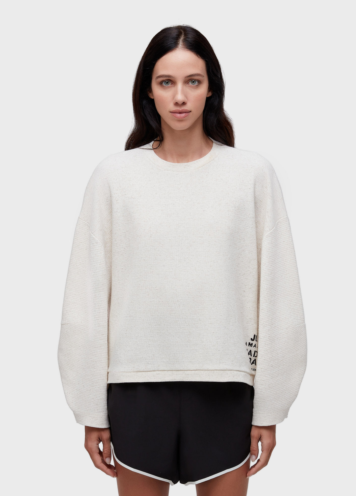 BLUSA DE MANGA LONGA FEITA EM MALHÃO COM JUTA; MANGAS PROJETADAS E APLICAÇÃO DE GALÂO LONGBOARD CENTRO COSTAS. BANDEIRA RP: JUTA DA AMAZÔNIA