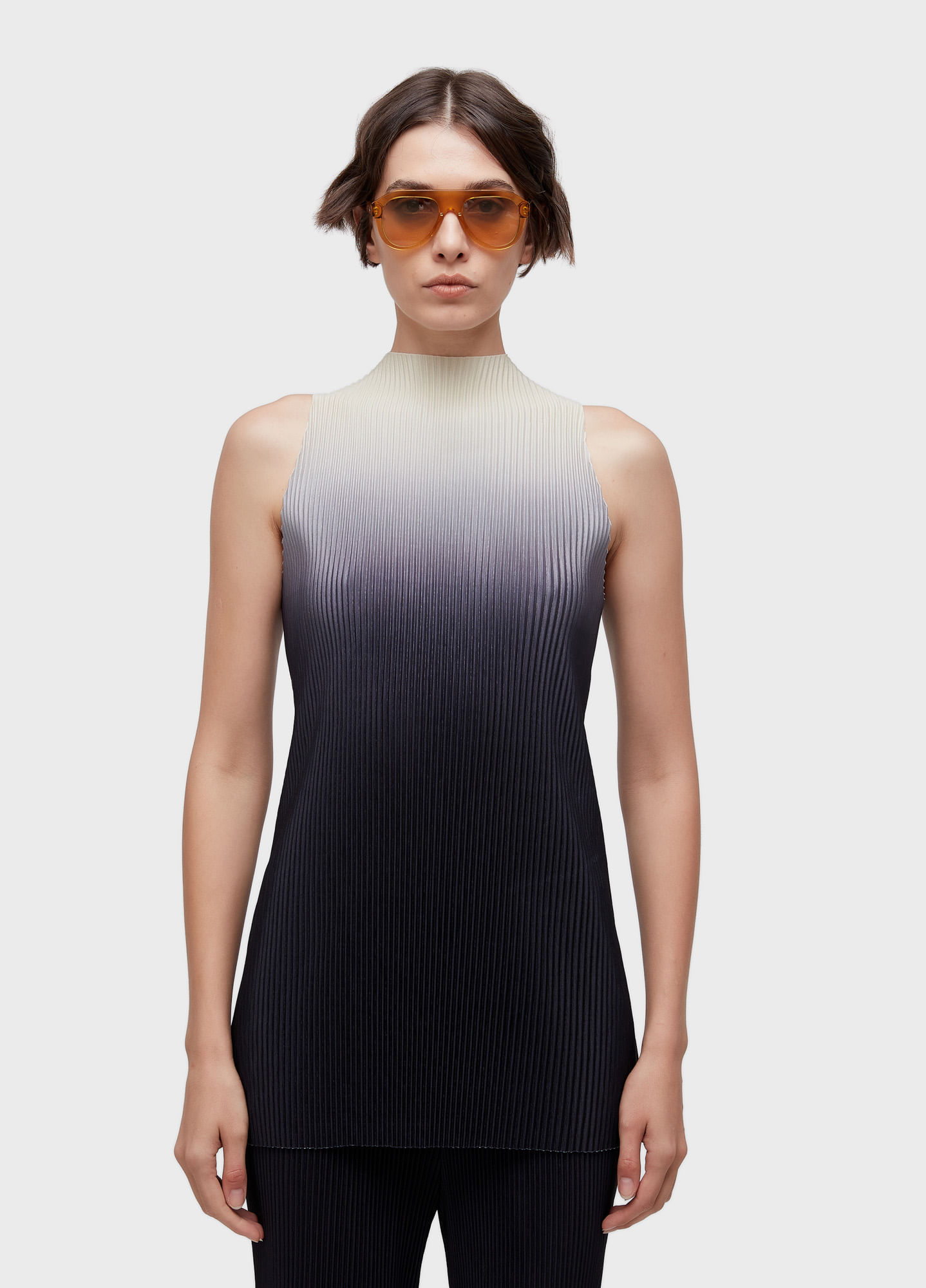 Blusa feminina, plissado médio, estampa degrade, cava raglan frente e costas, acabamento a fio