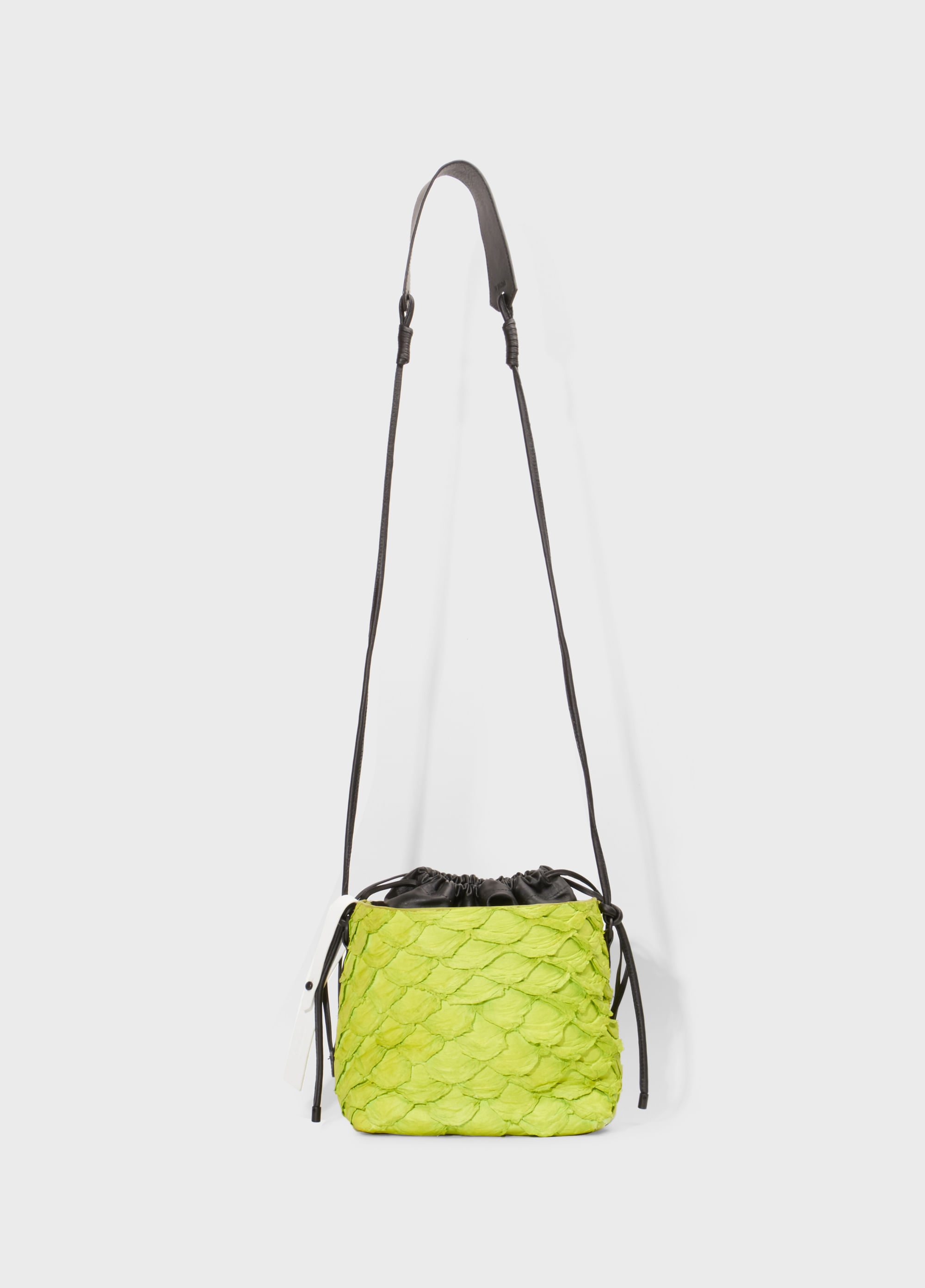 Bolsa de pirarucu com saquinho interno feito em couro bovino. Modelo bucket com couro de pirarucu contrastante, e forro de sarja 100% algodão. Possui alça regulável de rolotê de couro bovino. Produto Regenerete Life pois a pele do peixe Pirarucu usada pela Osklen atende às normas rigorosas de Manejo Sustentável e protegem a espécie do risco de extinção, além da própria floresta já que não envolve desmatamento.