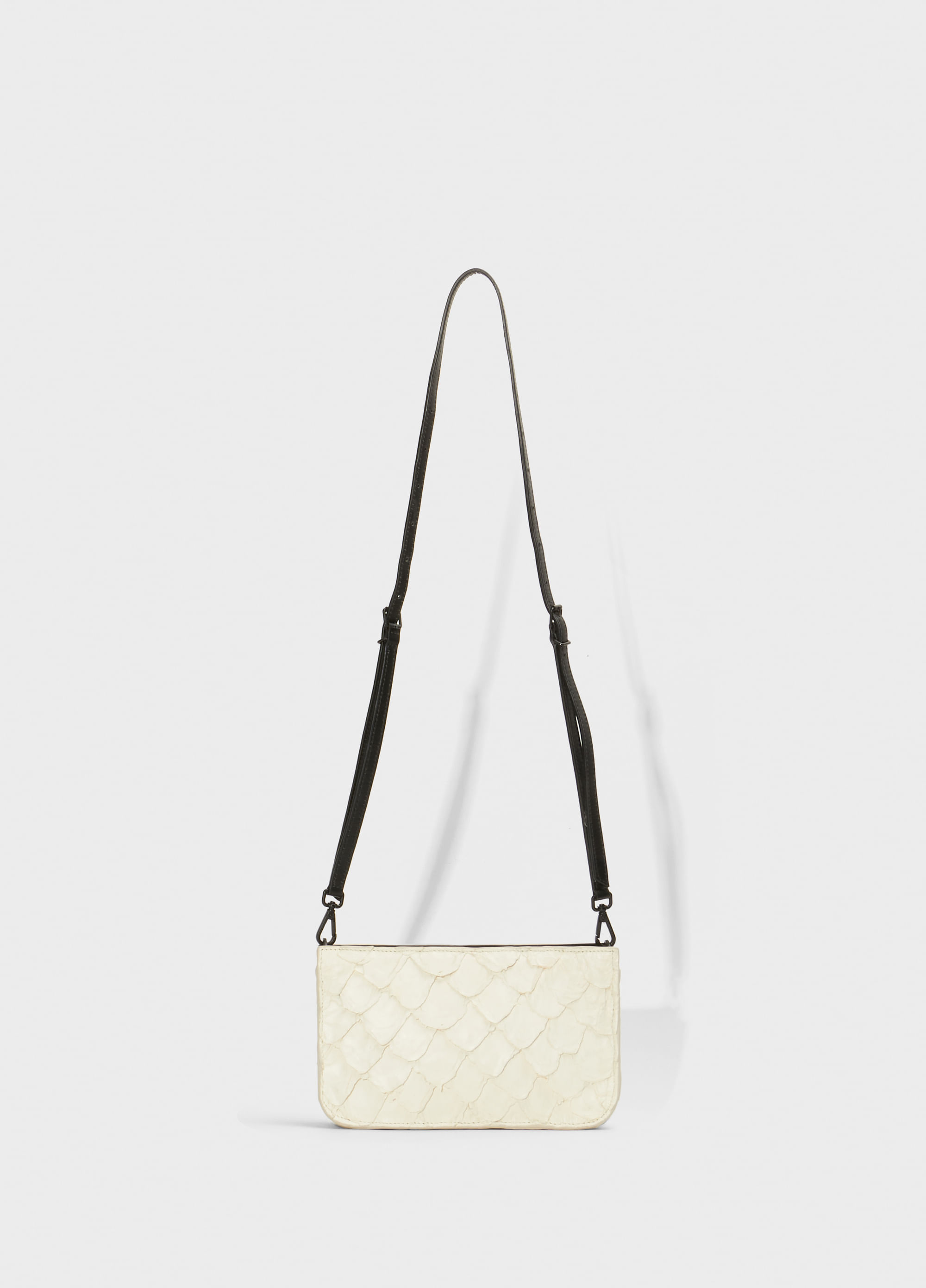 Bolsa de tamanho pequeno feita em pirarucu, e com a alça de couro bovino.acompanha uma alça extra de mão em corrente de metal dourada. Produto Regenerete Life pois a pele do peixe Pirarucu usada pela Osklen atende às normas rigorosas de Manejo Sustentável e protegem a espécie do risco de extinção, além da própria floresta já que não envolve desmatamento.