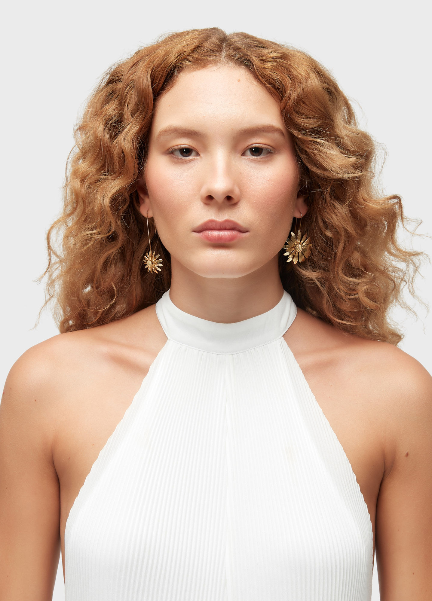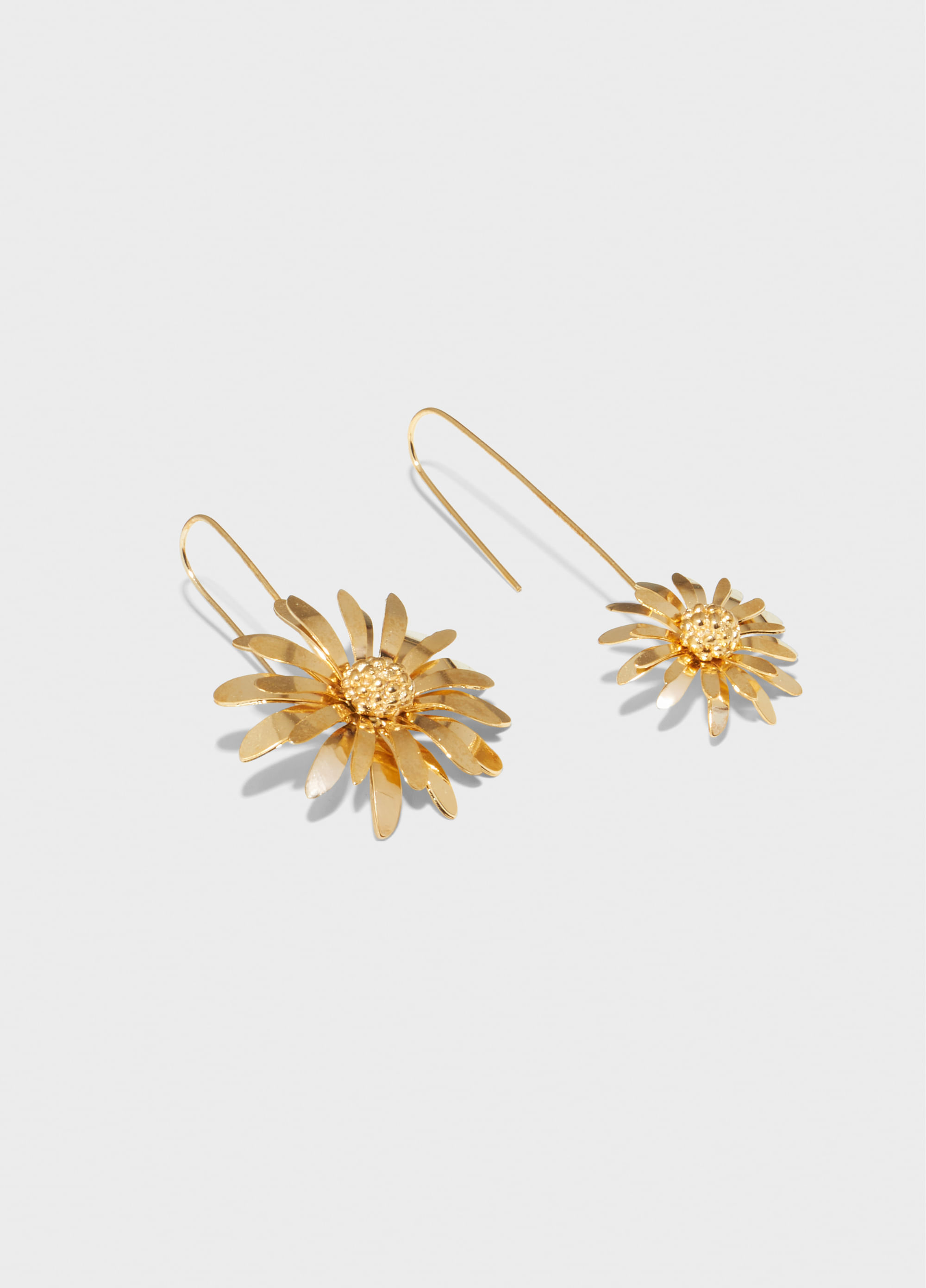 Par de brincos em metal dourado com margaridas em dois tamanhos, penduradas por hastes alongadas. Uma peça leve e elegante, perfeita para dar um toque floral e moderno ao visual.