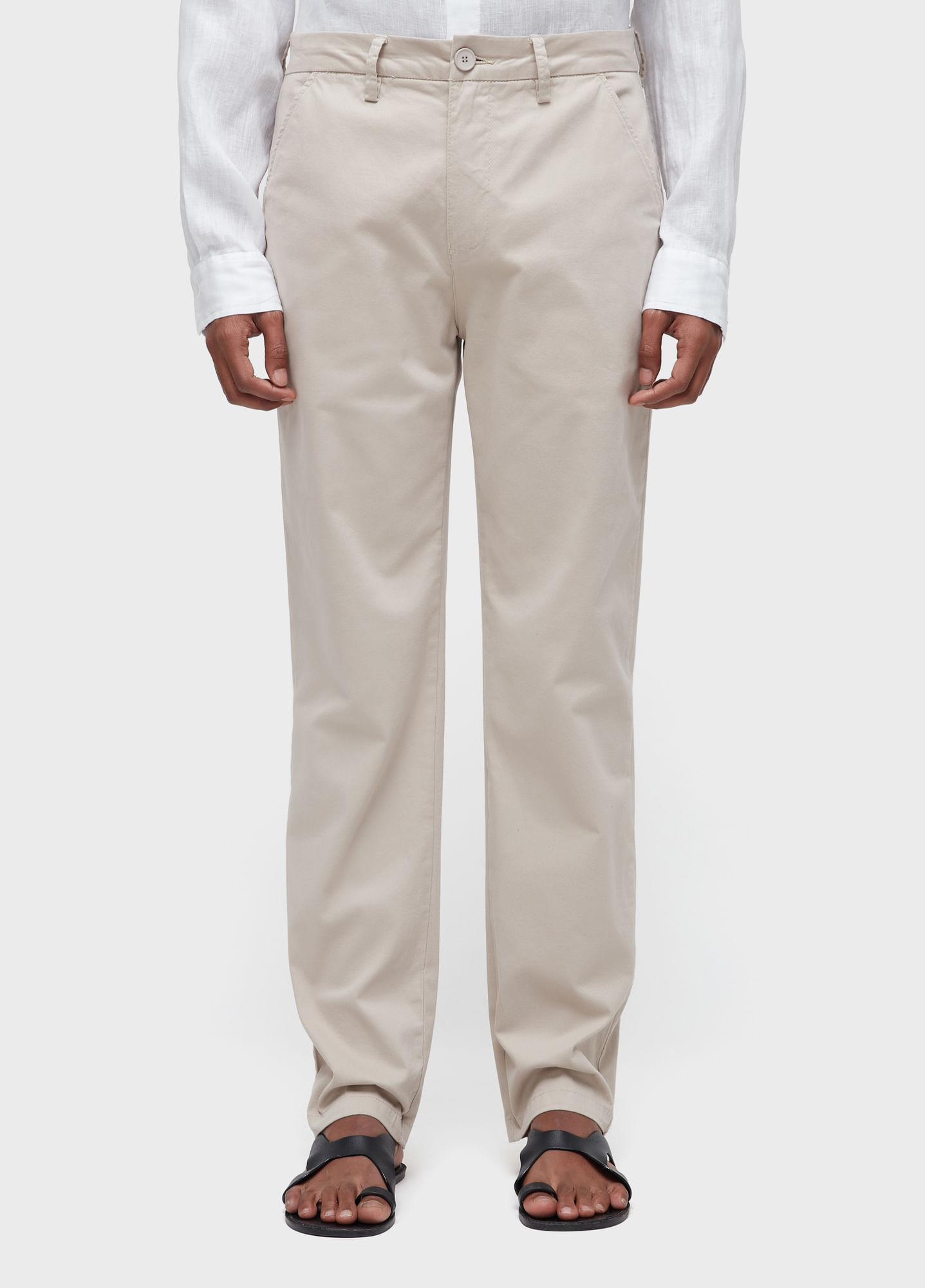 Tecido algodão com elastano, para dar comforto e toque empapelado. Cós de Alfaiataria. Peça lavada e tinturada.