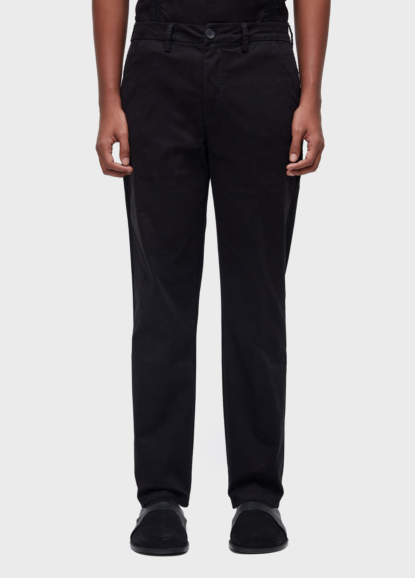 Tecido algodão com elastano, para dar comforto e toque empapelado. Cós de Alfaiataria. Peça lavada e tinturada.