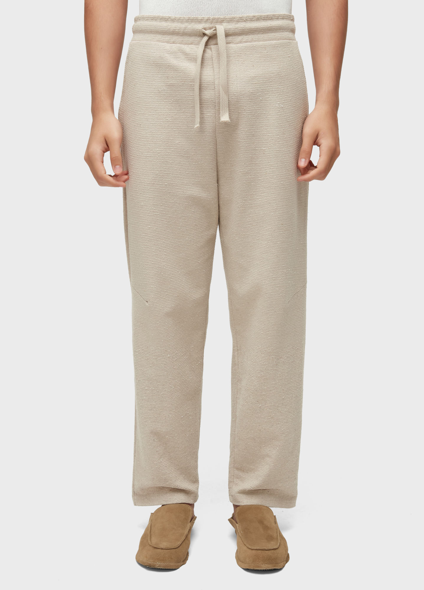 Calça masculina com tecido de fibras recicladas, com aparencia mais rustica. O tecido dessa peça foi produzido a partir do reaproveitamento de residuos texteis, separados por cores, que passam por um processo de reciclagem para serem transformados em um