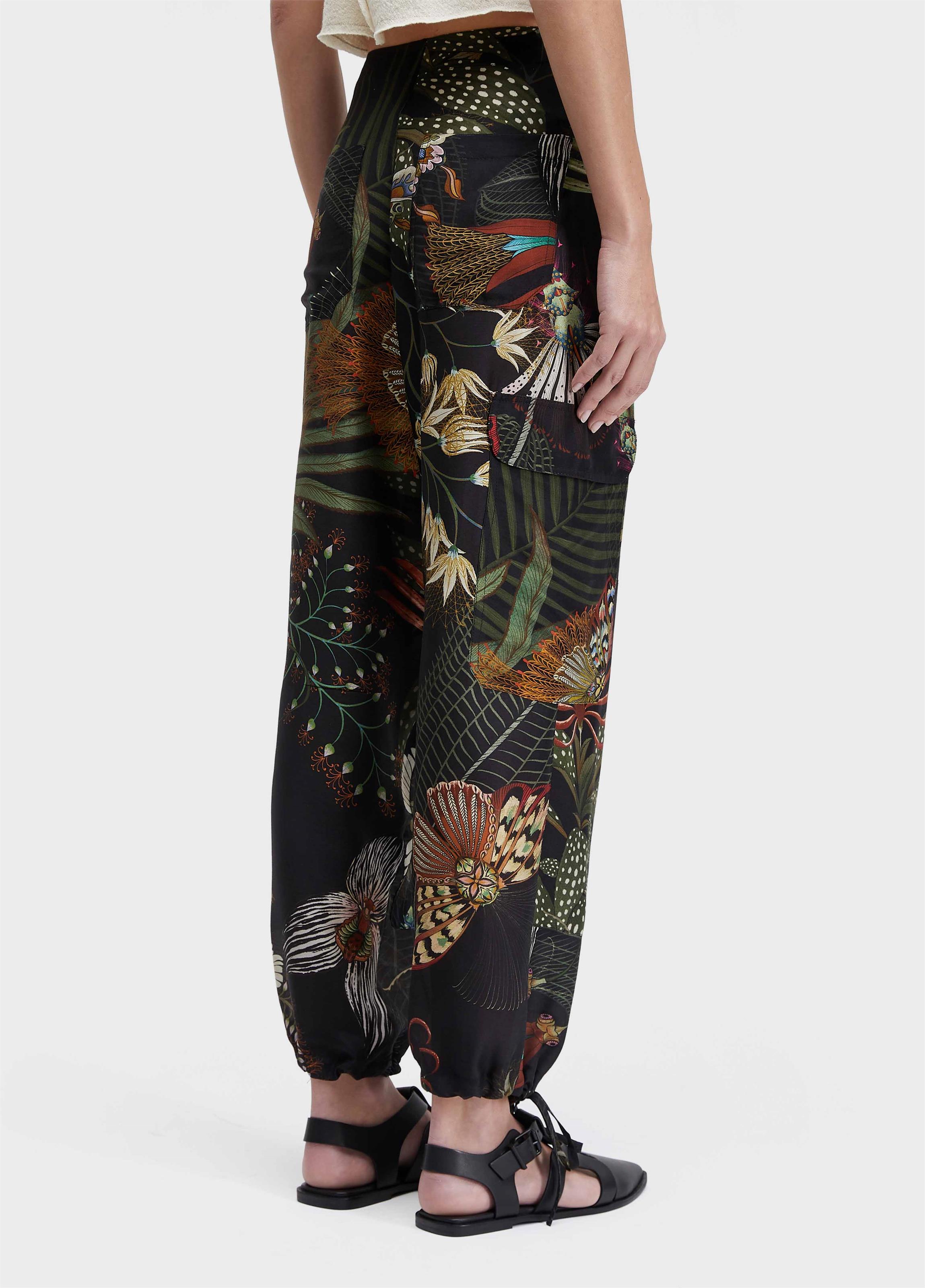 calça feminina; viscose com seda; modelagem over com bolsos frente e costas, recortes, amarração nas barras e no cós, com abertura frontal com zíper e colchete; caimento fluido; estampa BOTANIQUE