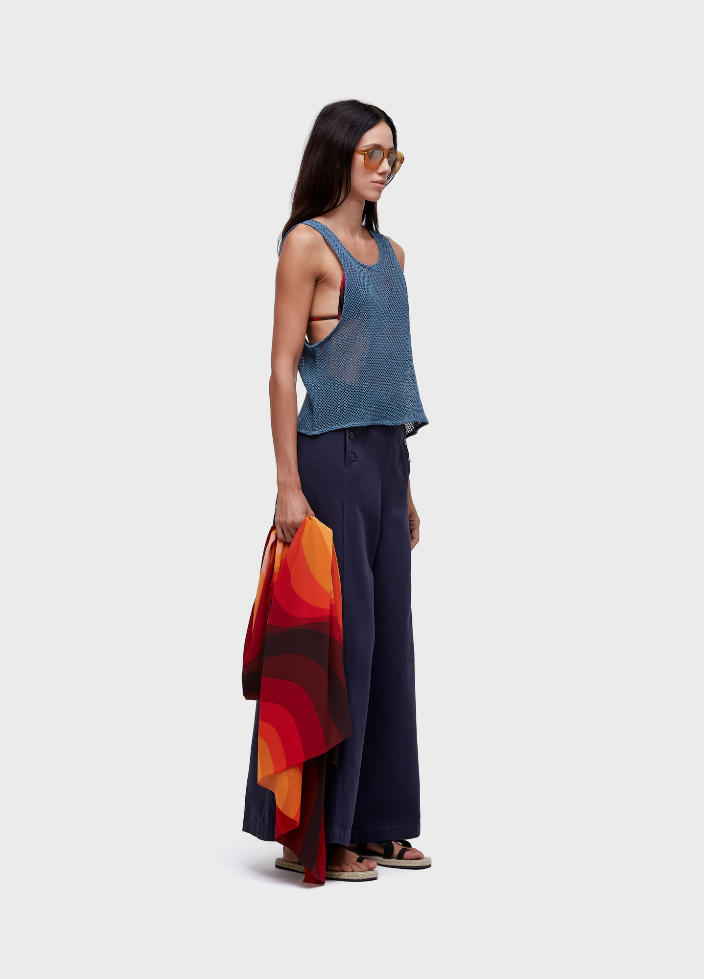 Calça jeans feminina, 100% algodão, cintura alta, pernas amplas, abotoamento tipo marinheiro na frente. Bandeira Regenerate life. essa peça foi produzida com algodão nacional certificado seguindo critérios minuciosos de redução dos impactos ambientais e sociais durante seu cultivo. seu processo produtivo utiliza energia renovável, reduz o consumo de água e fomenta as cadeias produtivas brasileiras.