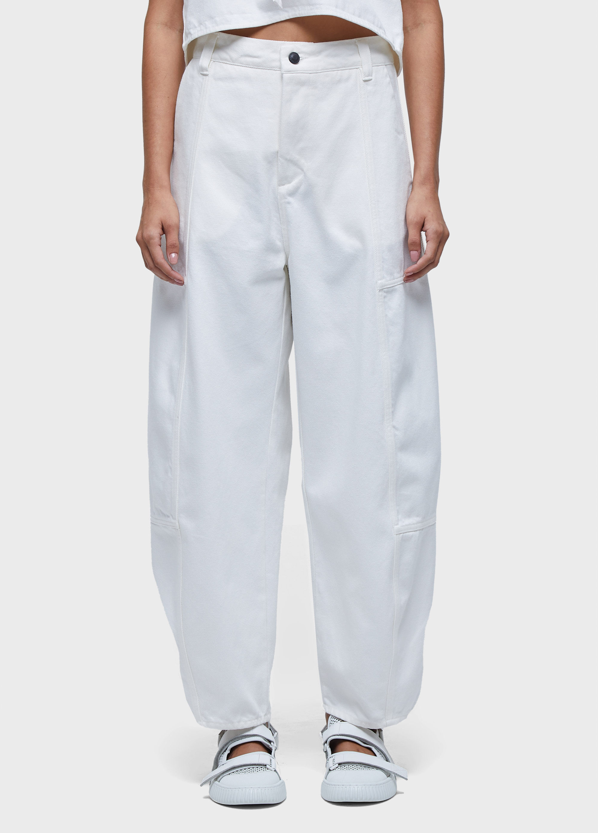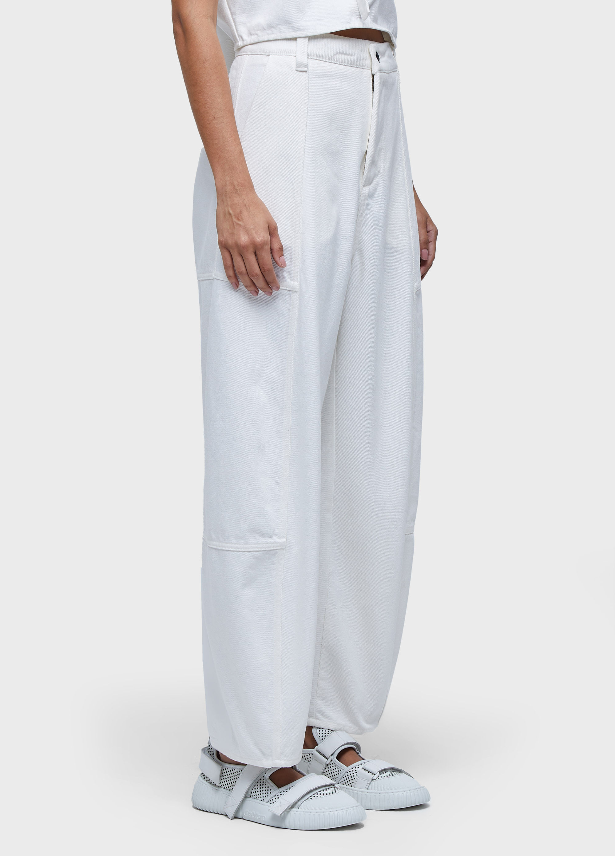 Calça modelagem barrel, tipo cenoura, em tecido de algodão certificado. Modelagem cintura média e peça solta no corpo. A peça possui bolso faca nas laterias, joelho projetado e diversos recortes. Fechamento frente com zíper e botão flexível. Tecido 100% algodão. Essa peça foi produzida com algodão nacional certificado seguindo critérios minuciosos de redução dos impactos ambientais e sociais durante seu cultivo. Seu processo produtivo utiliza energia renovável, reduz o consumo de água e fomenta as cadeias produtivas brasileiras. Bandeira Regenerate Life.