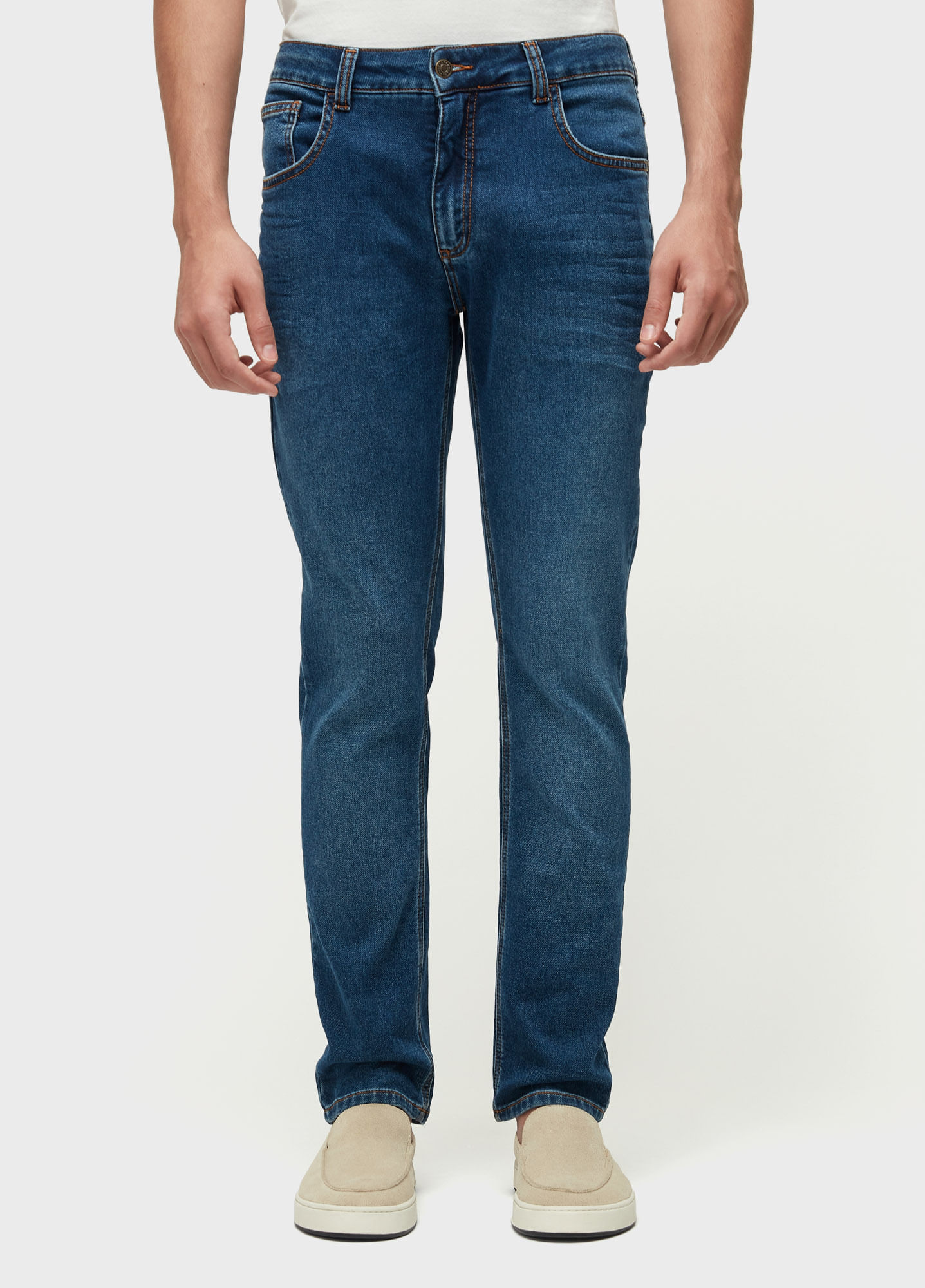 Calça jeans-e masculina feita de algodão, poliester a elastano com modelagem slim fit de cintura media. Desenvolvido para gerar o menor impacto socioambiental possível. Priorizamos beneficiamentos e processos produtivos que reduzem em até 95% o uso de água quando comparados aos processos tradicionais.