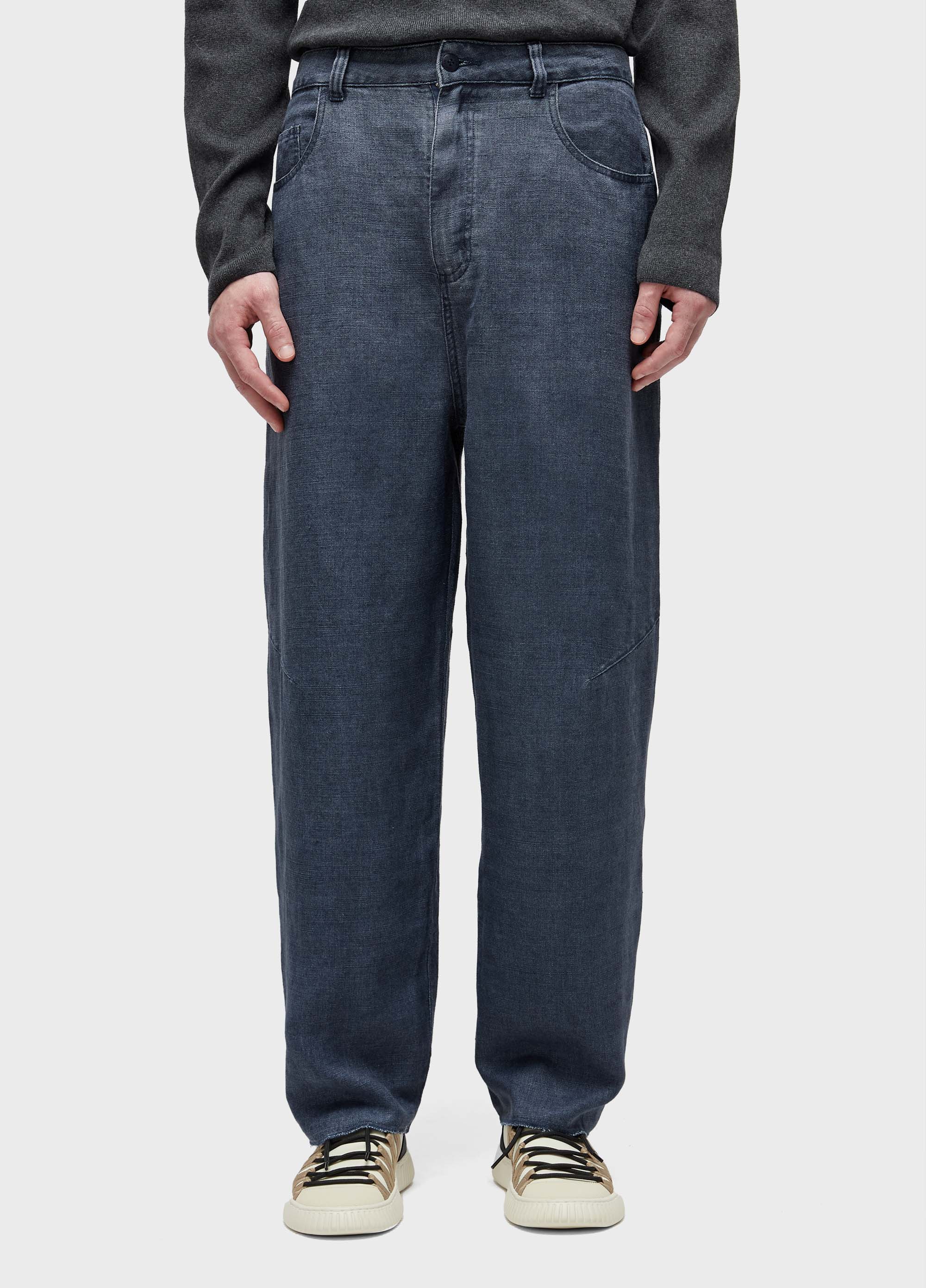 Calça em modelagem levemente abaolada com projeção de joelho. Tecido de linho estonado. Fibras nobres + Organic Mint Wash.