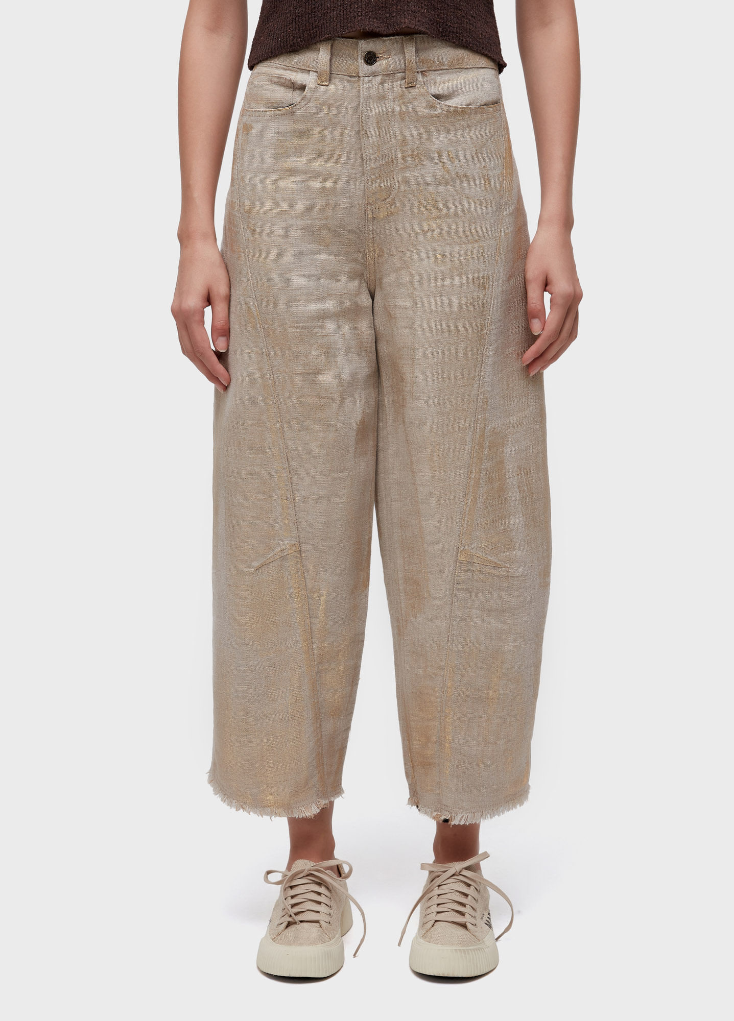 Calça jeans feminina, Juta com Linho com foil dourado, modelo tokio: regular fit com cintura média, joelho projetado e barra reta. recorte diagonal na peça e pence no joelho. Bandeira Regenerate Life. Essa pe?a foi criada a partir da fibra da Juta, uma planta cultivada de forma natural, sem a utilização de agrotóxicos e insumos químicos.