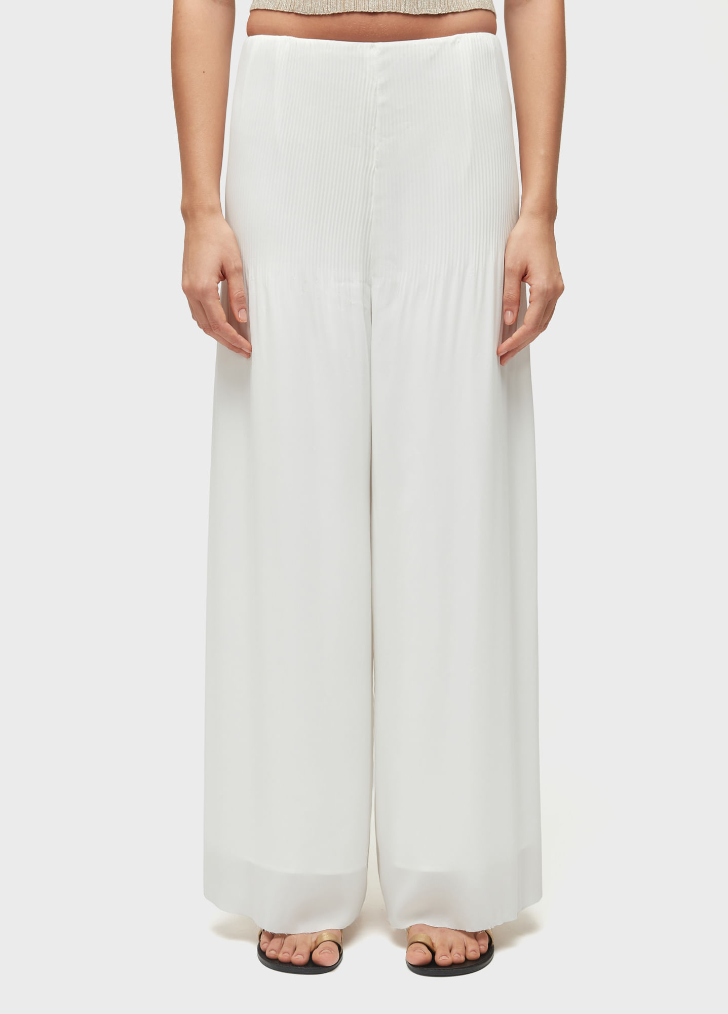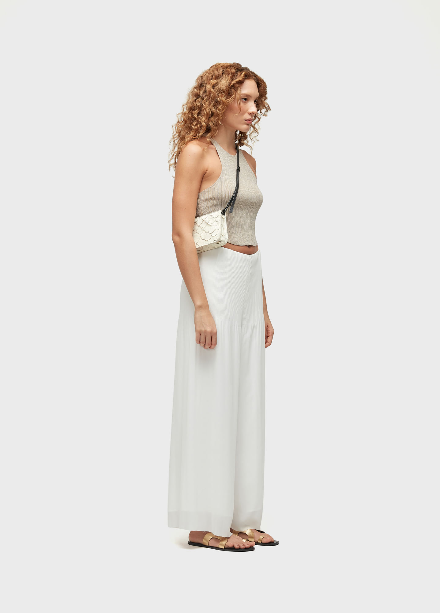 calça feminina; plissado 100% poliéster com forro 100% viscose; modelagem ampla com cós plissado e abertura com zíper nas costas; caimento fluido