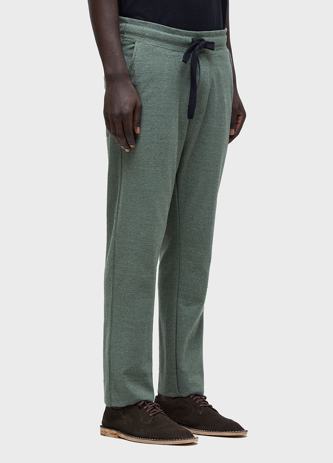Calça E-Basics em malhão Rústico E-Fabrics com algodão reciclado, proveniente da sobra de resíduos têxteis. Essa peça promove a economia circular. Durante o processo, as fibras são separadas por cor e desfibradas para criação de novos fios. Dessa forma, podem existir pequenos pontos de outras cores e isto faz parte da característica natural do produto. Essa iniciativa elimina o uso de produtos químicos, economiza água e minimiza o volume de resíduo têxtil, diminuindo os impactos ambientais. Bandeira: Redesign Waste