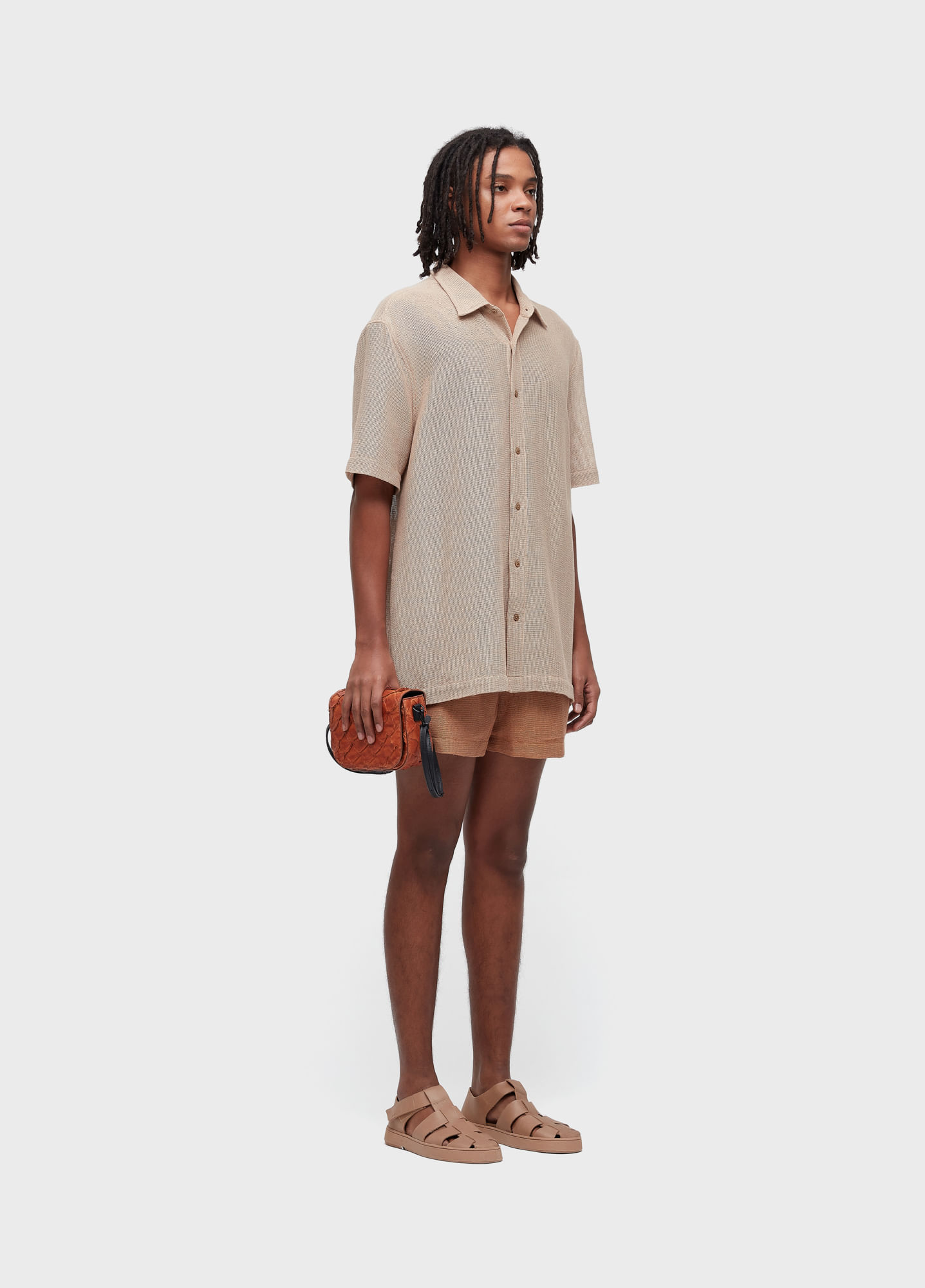 Camisa Manga curta, modelagem levemente ampla, feita em algodão telado rustico.