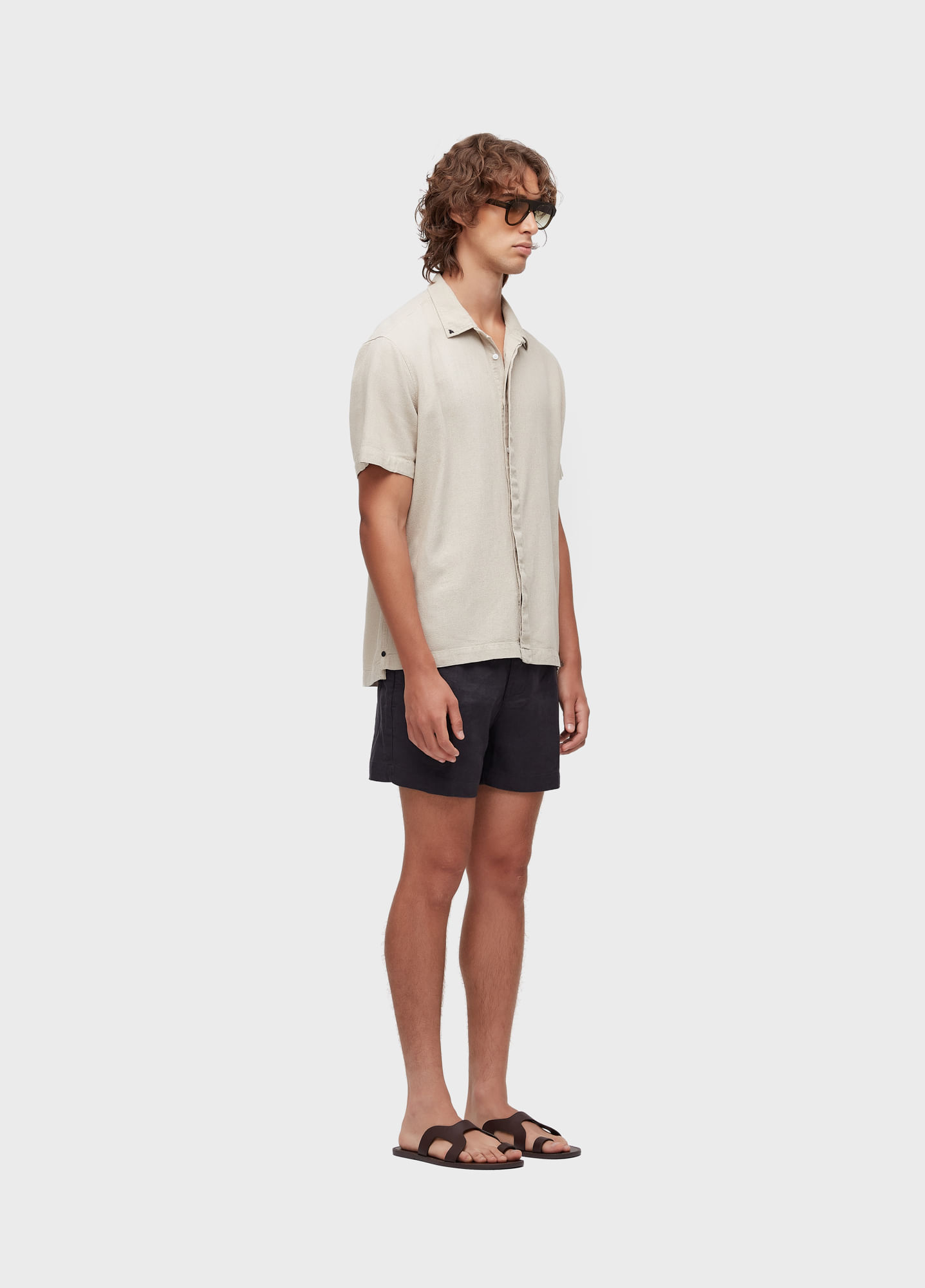 Camisa manga curta, modelagem levemente ampla, com detalhe de bordado na gola frente e na pala costas. Peça feita em linho misto.