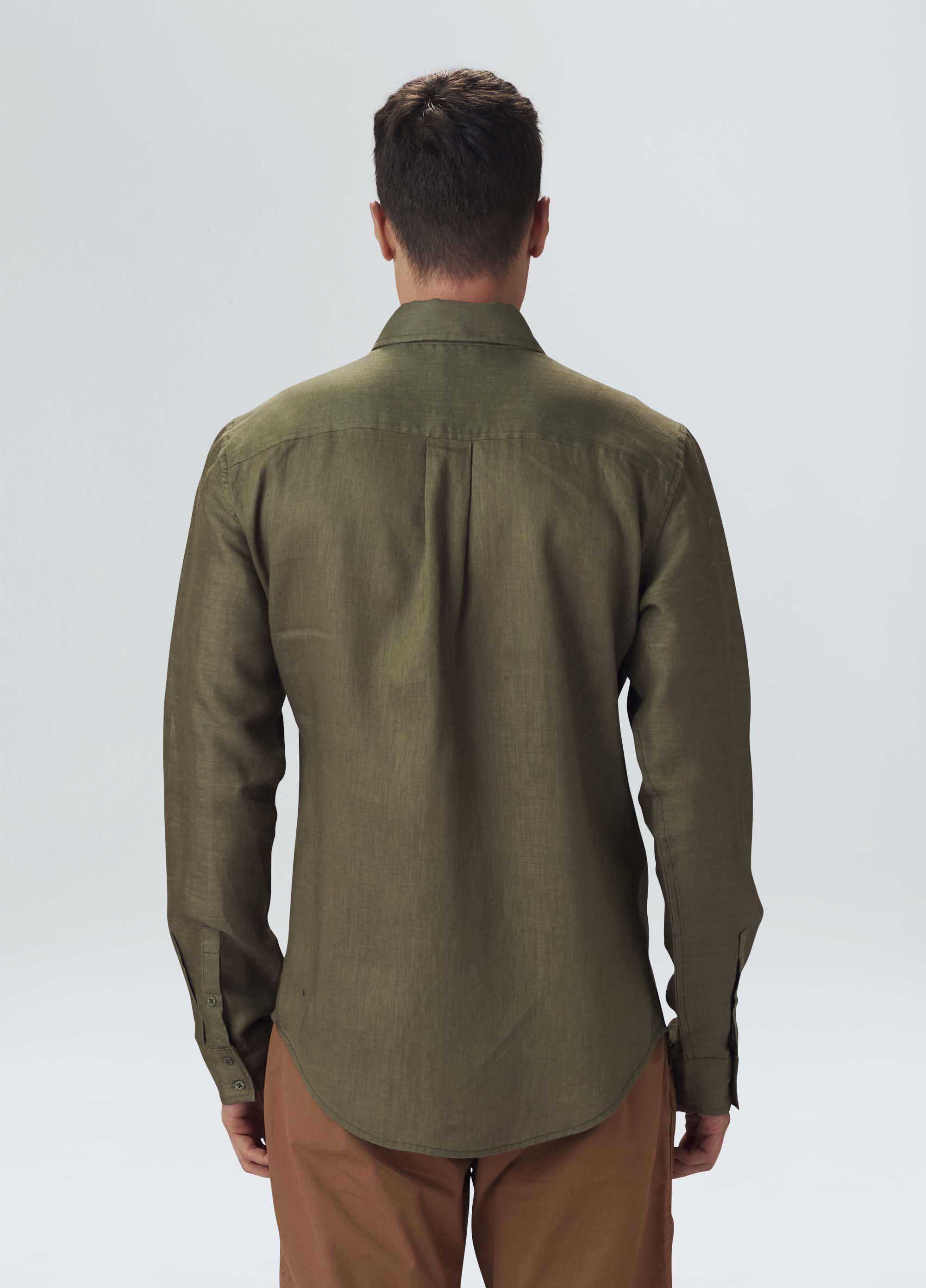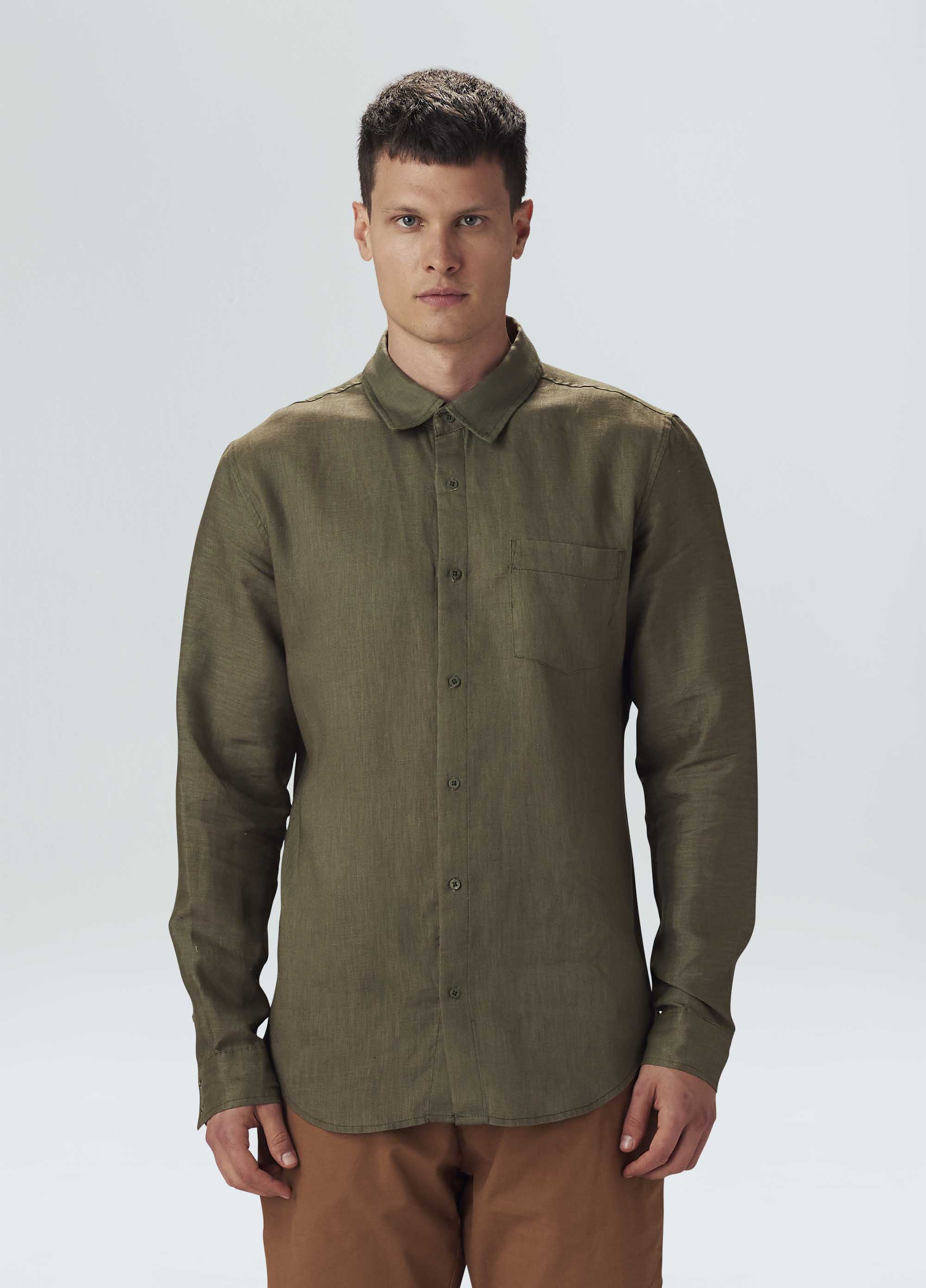 Camisa masculina de manga longa, base de modelagem Casual, mais solta e acinturada. Tecido leve 100% linho. Peça lavada e amaciada.