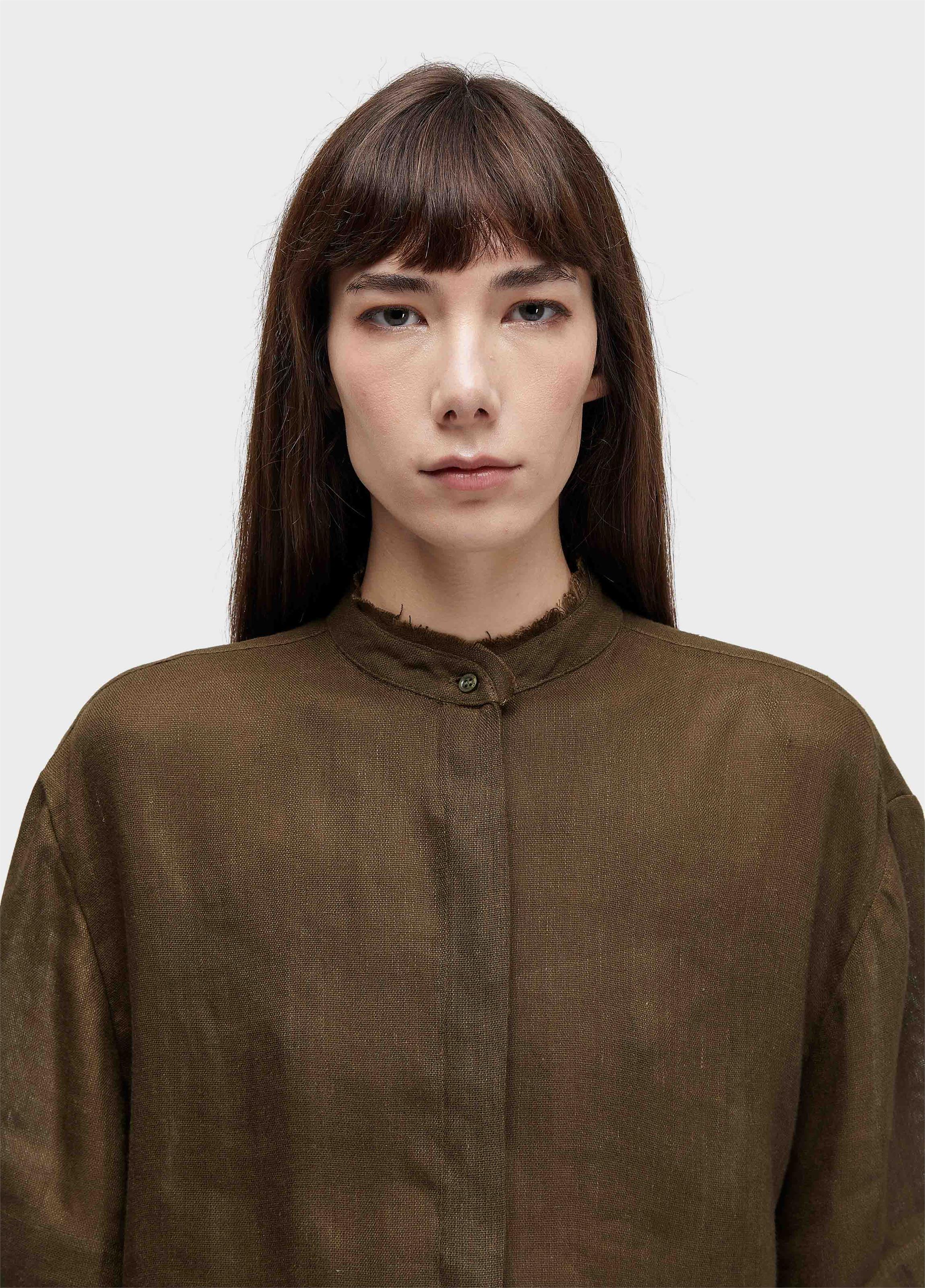 camisa modelo manga curta feminina; linho reciclado; modelagem regular com gola padre e barra desfiada, abotoamento na frente e pala dupla; caimento fluido; Redesign Waste; E-fabrics - Linho Reciclado