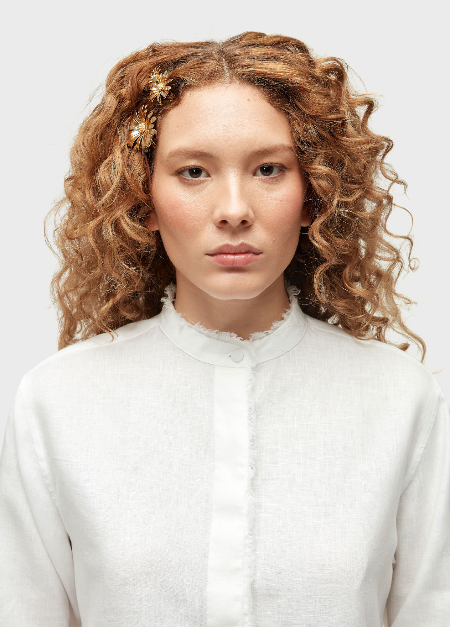 camisa manga longa feminina; 100% linho; modelagem fit, comprimento do corpo mais curto, abotoamento com botão madrepérola na frente e nos punhos e acabamentos desfiados; Regenerate Life; E-fabrics - Linho E;