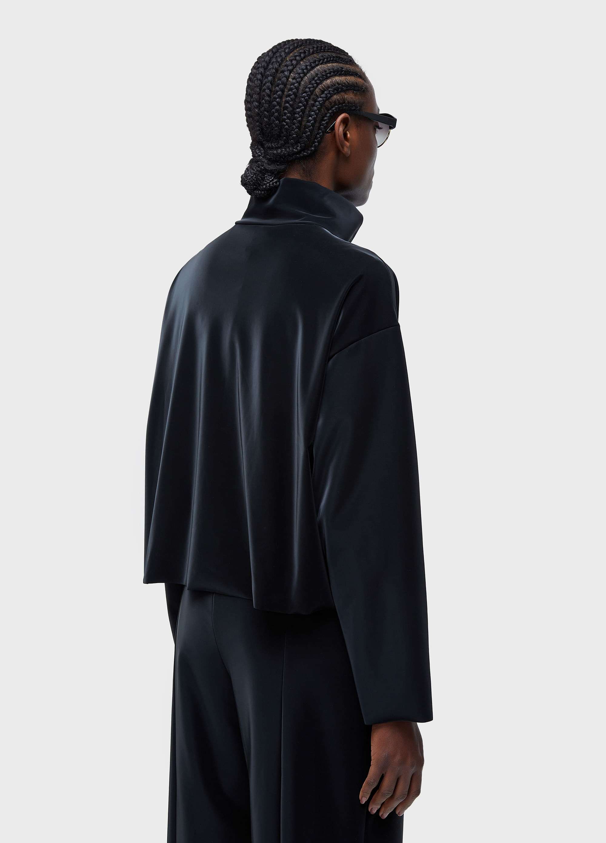 Casaco gola alta e modelagem cropped; feito em malha emborrachada;