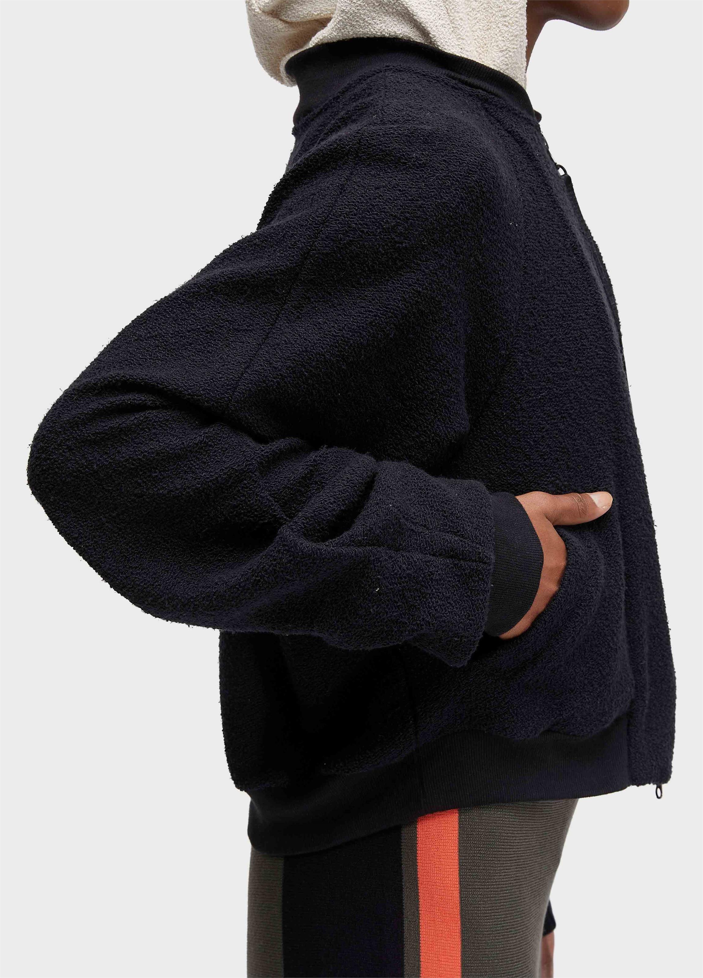 Casaco bicolor com capuz, pala, e bolsos laterais. Fechamento com zíper de metal. Punhos e barras em ribana. Feito em moletom com fibras recicladas e amaciadas. Bandeira RW - Recycle Fibres.