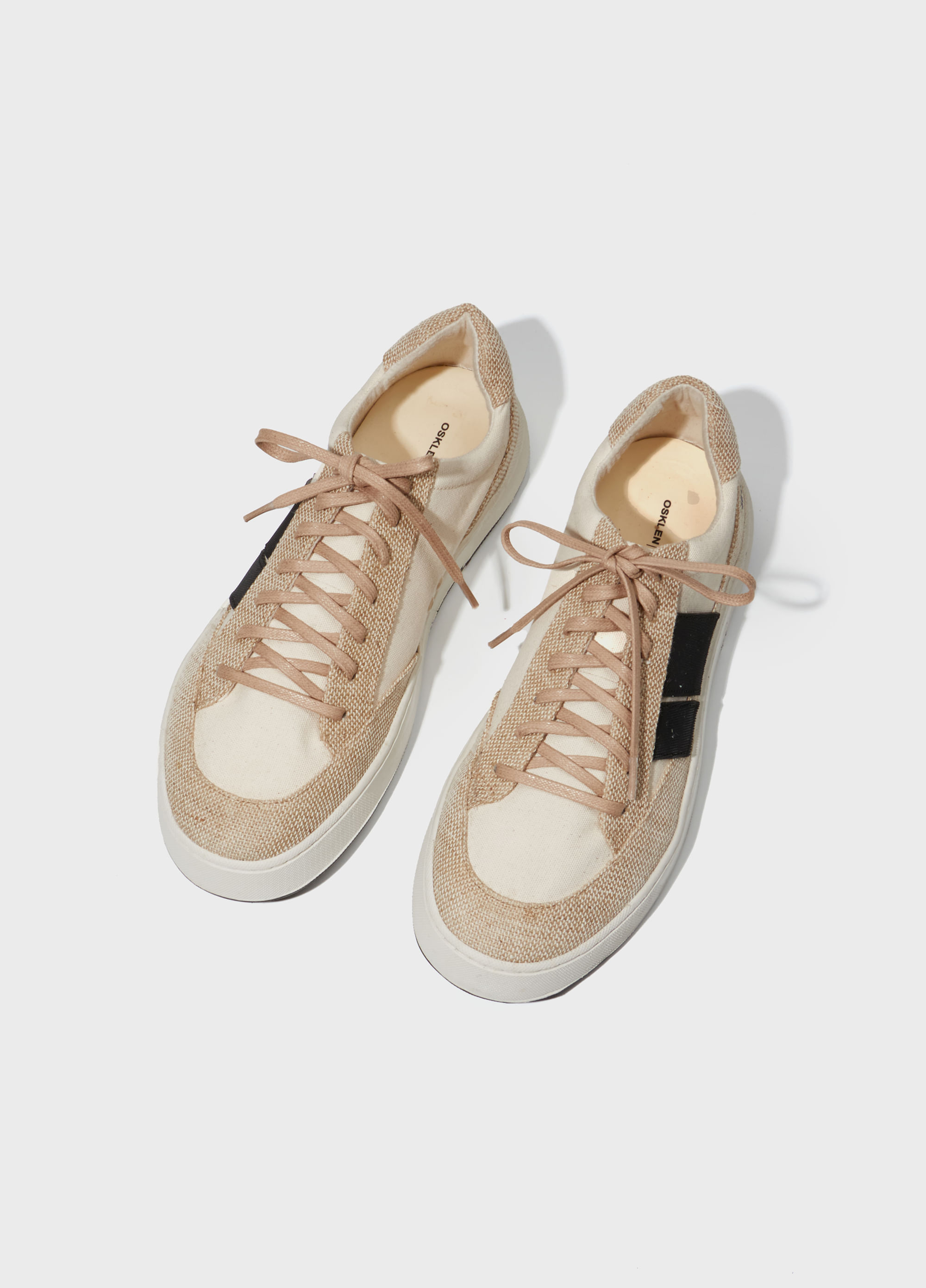 Tênis em lona de algodão reciclado e Juta. A Juta é uma planta cultivada sem a utilização de agrotóxicos, herbicidas ou fungicidas e com adubação natural feita através do húmus deixado pelas cheias dos rios. Assinatura lateral em borracha texturizada feita com látex natural da Amazônia. Modelo de amarração com duas cores de cadarços de algodão. Forro em sarja de algodão e palmilha de EVA Verde. Solado Soho de borracha feita com látex natural da Amazônia e resíduos reciclados, design exclusivo Osklen. Esse produto carrega as 3 bandeiras de sustentabilidade da marca: Regenerate Life, Respect our People, e Re-Design Waste.