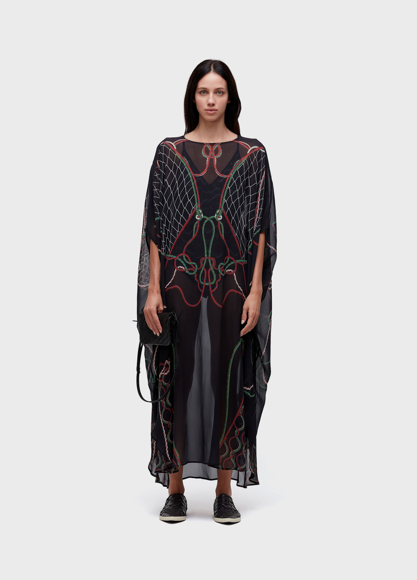 Kaftan com a estampa localizada Nós. Estampa exclusiva da Osklen. A peça é longa, possui decote careca e modelagem ampla. Tecido 100% Seda.