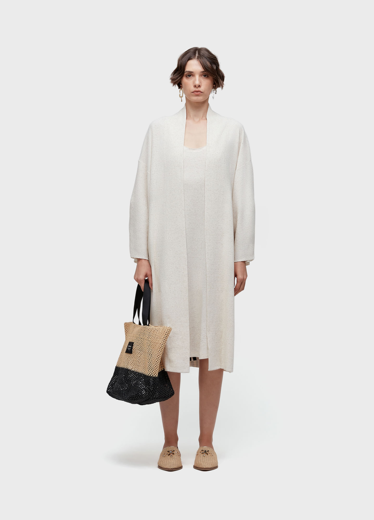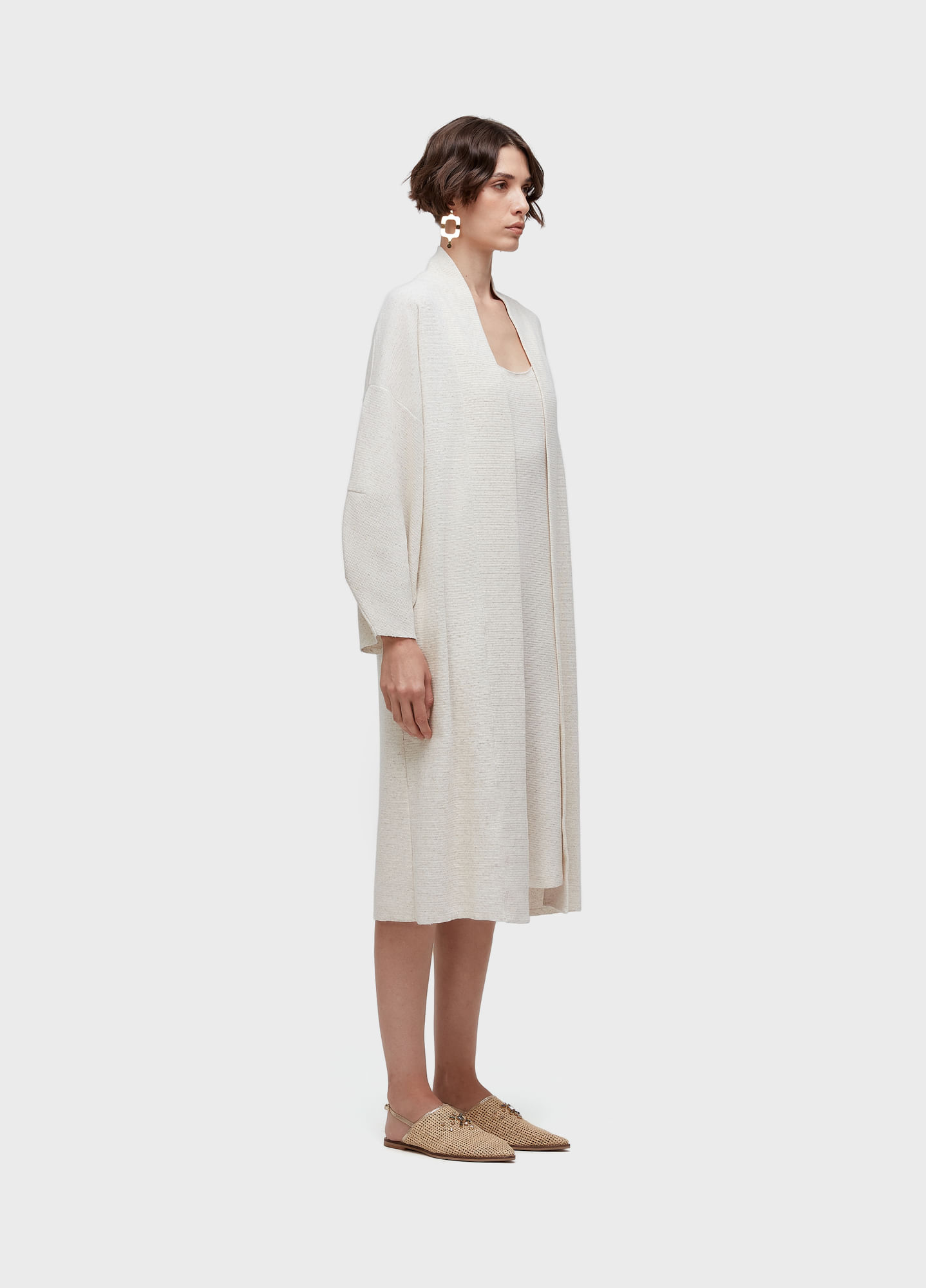 DUO KIMONO E VESTIDO FEITO EM MALHÃO COM JUTA; O KIMONO COM MANGAS PROJETADAS E APLICAÇÃO DE GALÃO LONGBOARD APLICADO NAS COSTAS; VESTIDO COM MODELAGEM RETA E DECOTE COSTAS NADADOR. BANDEIRA RP: JUTA DA AMAZONIA
