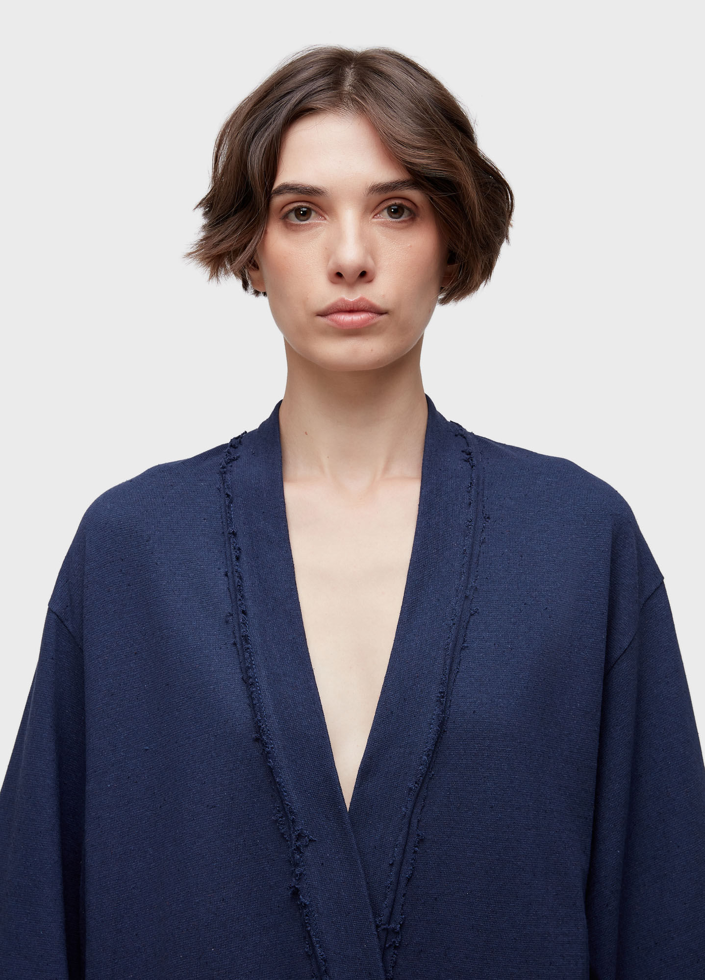 KIMONO OVERSIZED COM ACABAMENTO DESFIADO; FEITO EM MALHA RÚSTICA COM FIBRAS RECICLADAS; NA COR MARINHO. PEÇA AMACIADA COM MENTA ORGÂNICA. BANDEIRA RP - ORGANIC MINT WASH