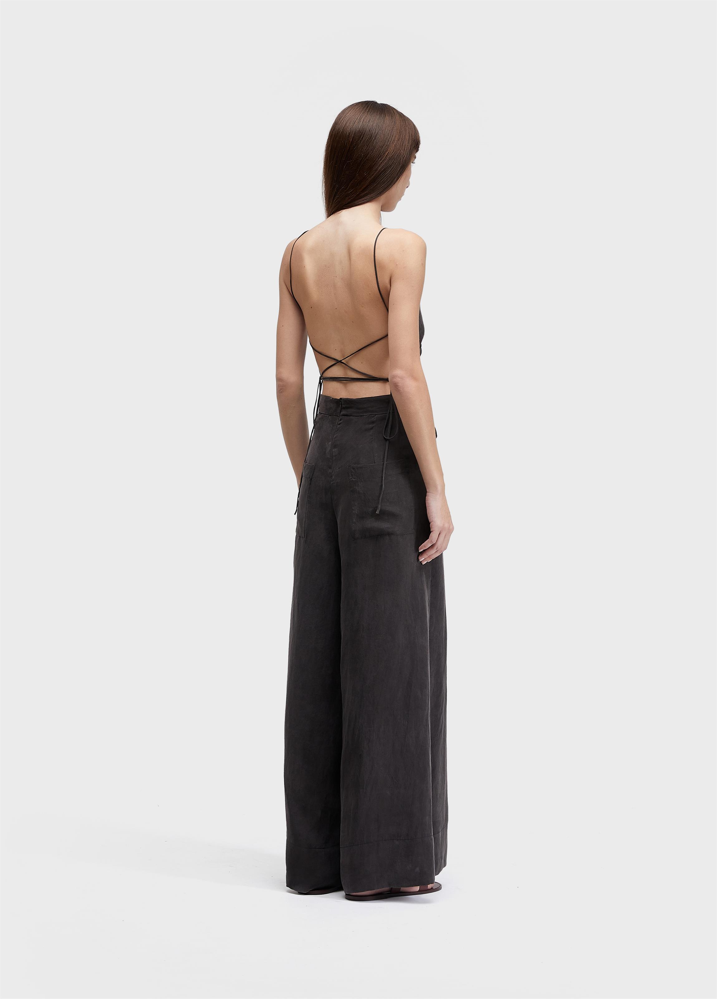 macacão frente única feminino; 100% cupro; modelagem acinturada com bolsos frente e costas, amarração e abertura com zíper nas costas; caimento fluido;