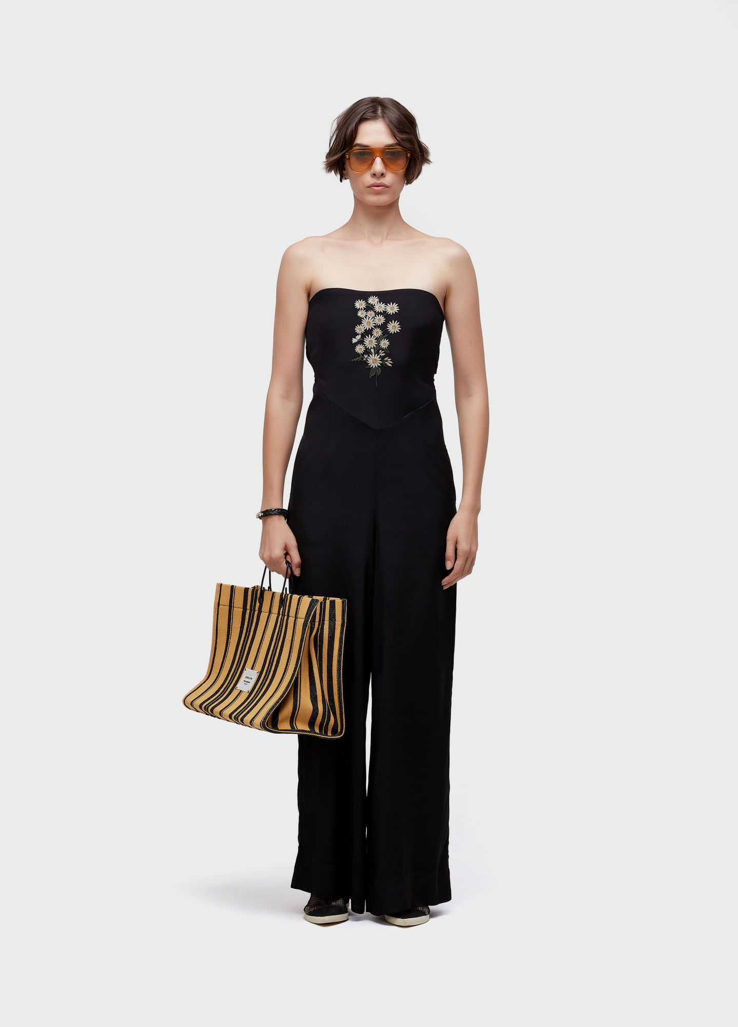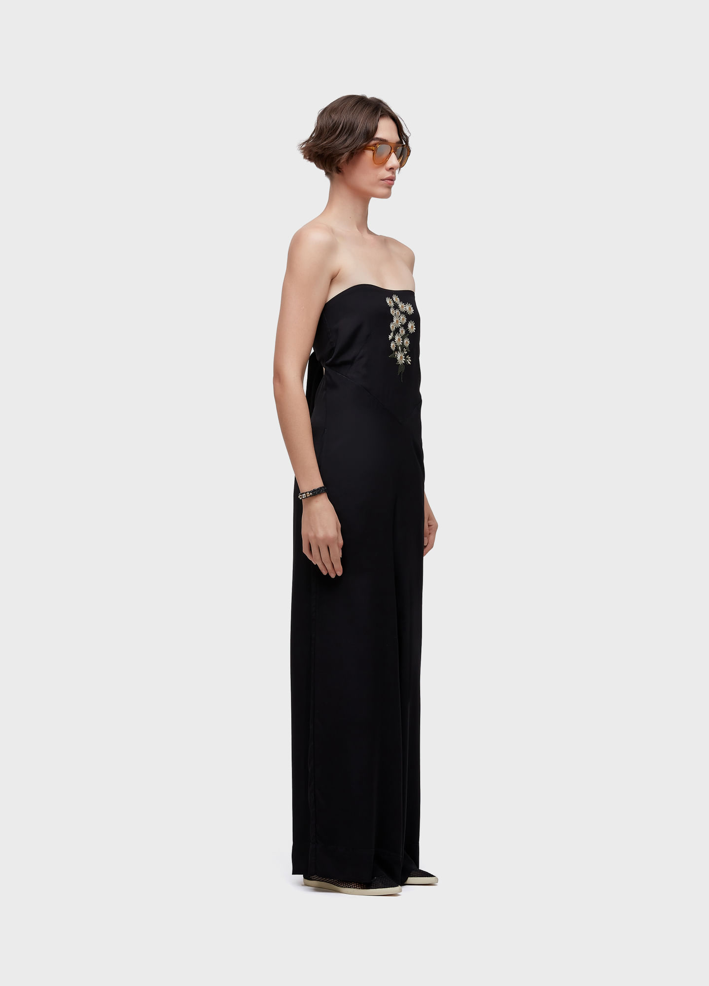 Macacao. Feminino. Viscose. Decote reto, alcas finas removiveis, recorte na cintura, amarraco nas costas. Bordado bouquet daisy