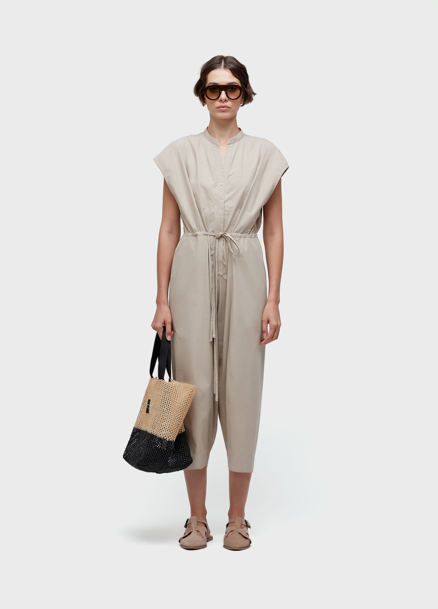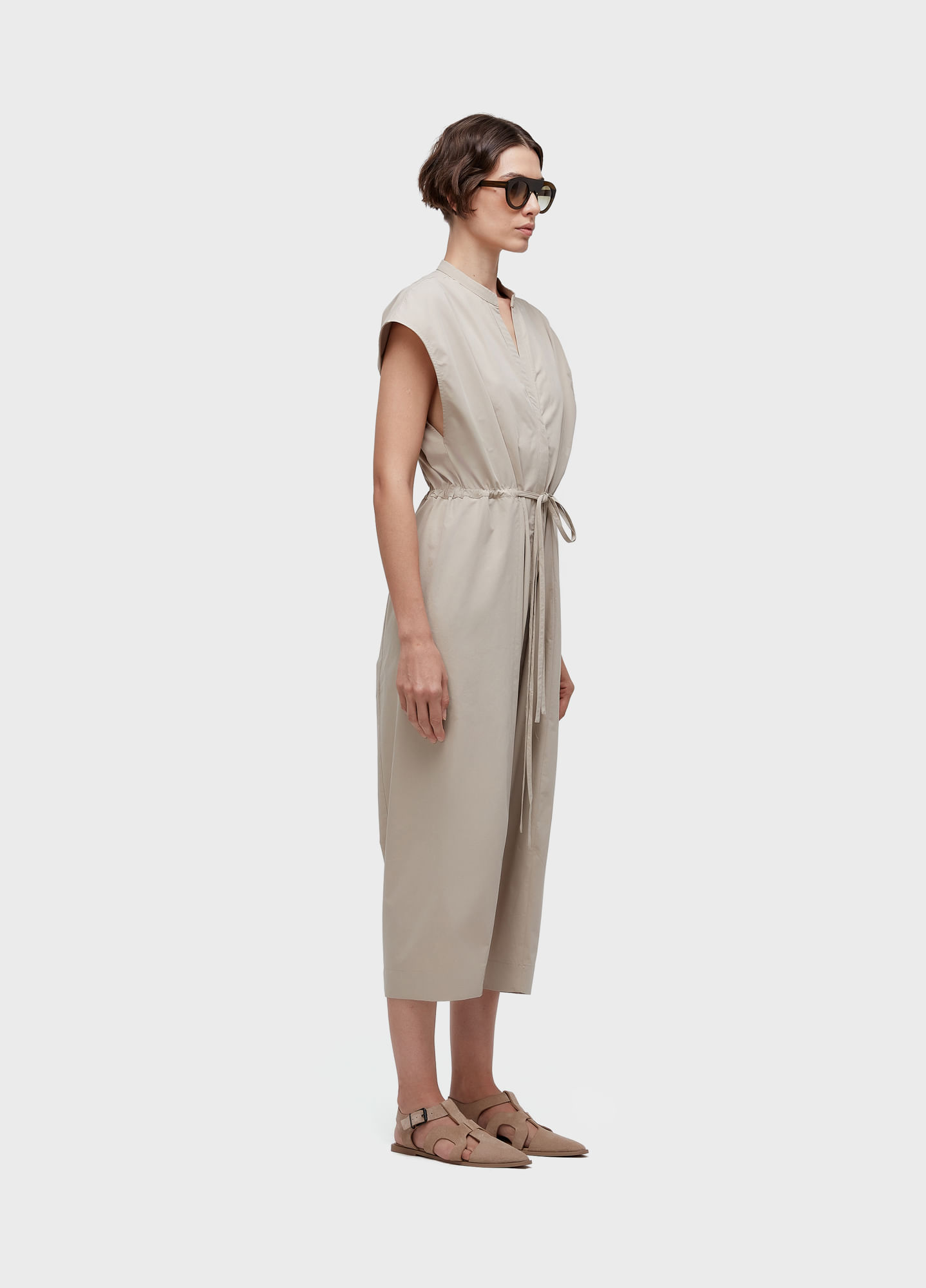 Macacão feminino,sleeveless, decote em V, oversized, com abotoamento invisivel e amarração na cintura em 100% algodão.