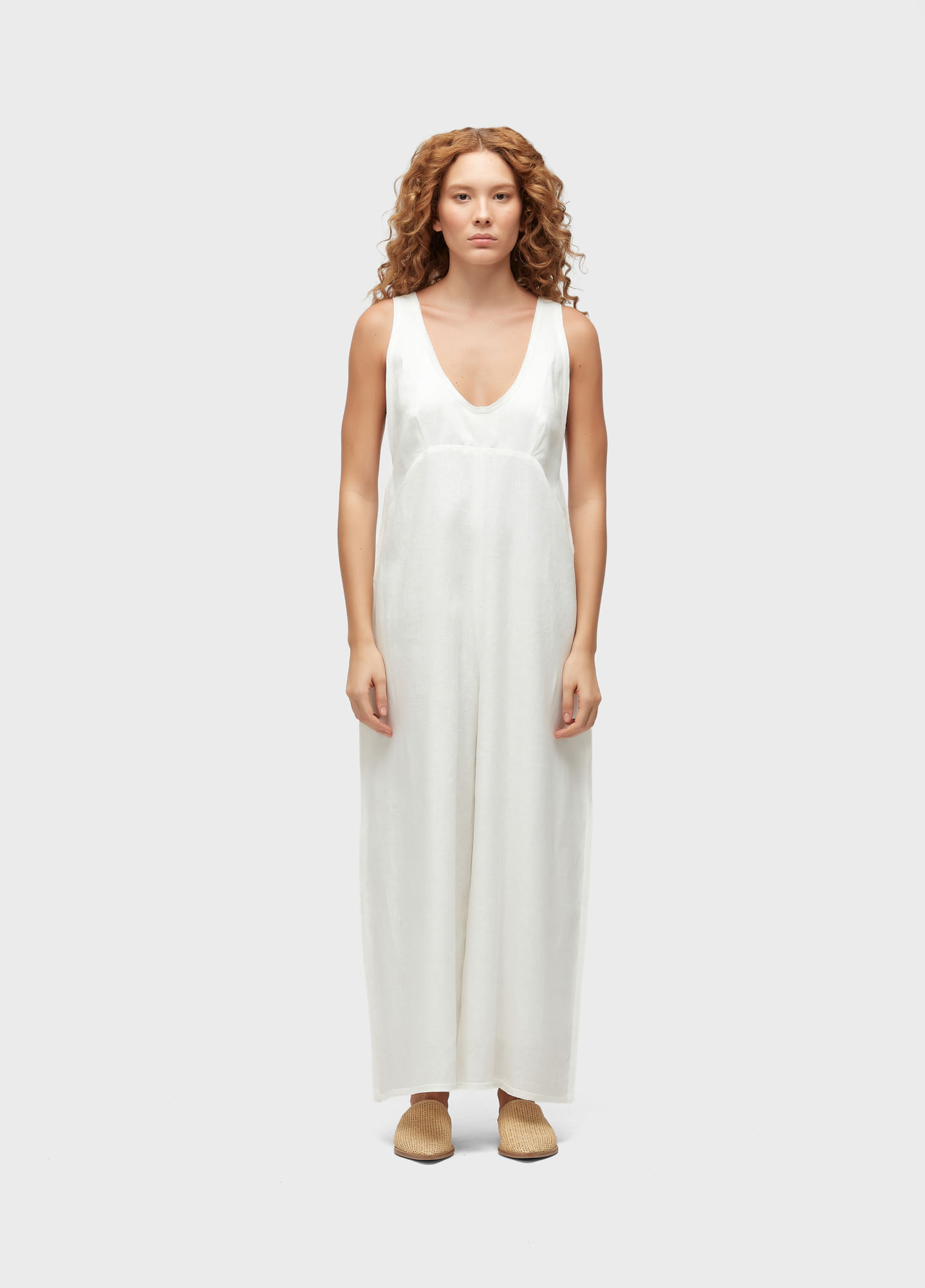 macacão feminino; 100% linho; modelagem ampla, recorte na cintura, abertura com zíper nas costas e acabamentos desfiados; Regenerate Life; E-fabrics - Linho E;