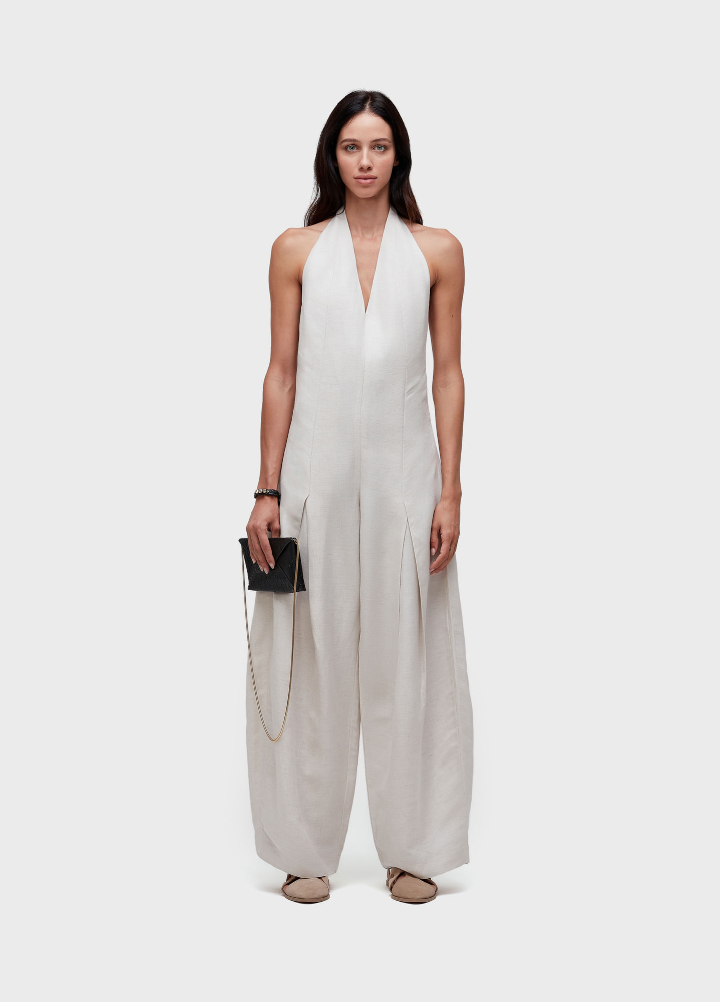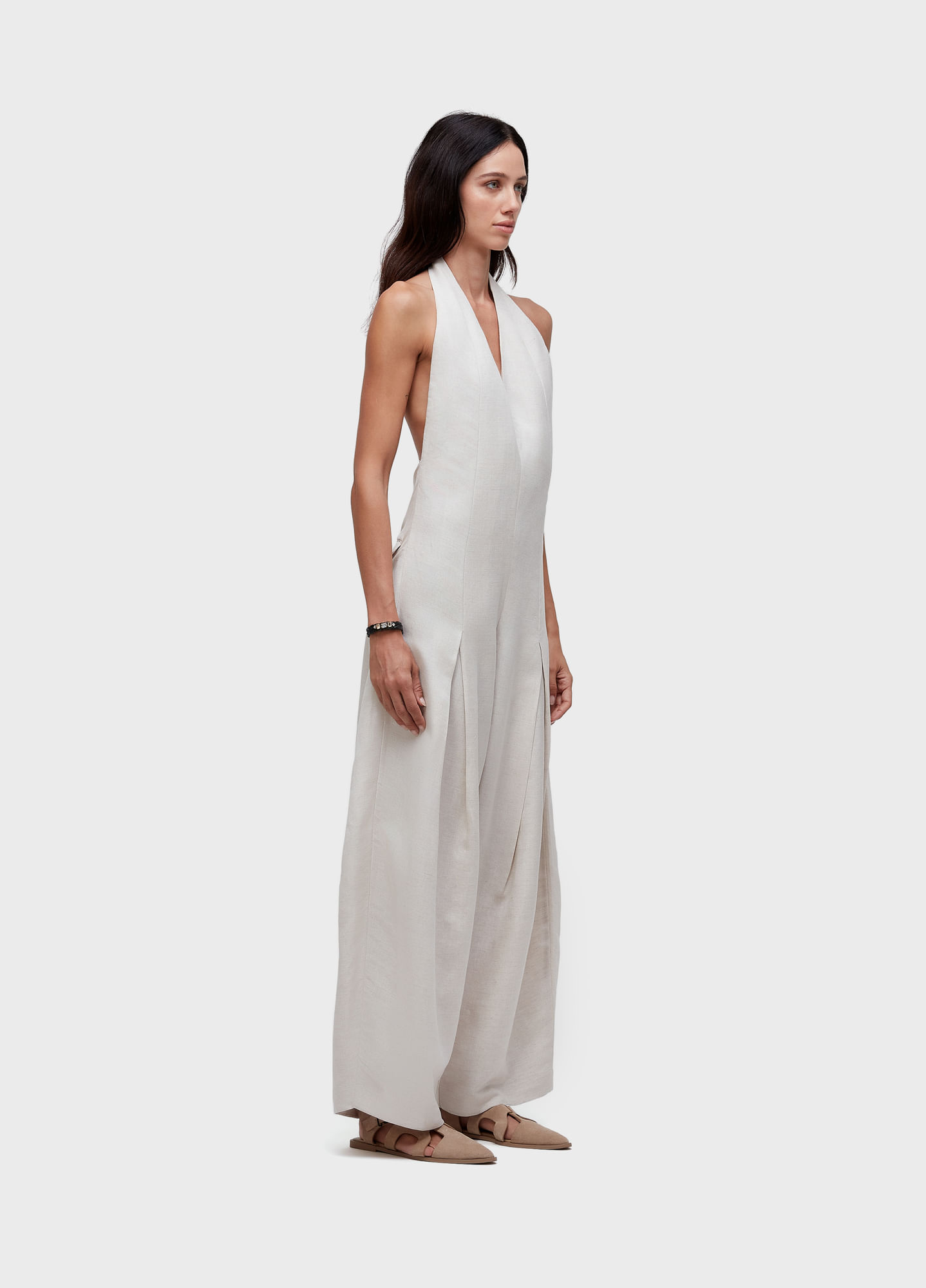 Macacao frente unica. Feminino. Linho com viscose. Costas abertas com abotoamento no pescoco, pregas nas frentes e nas costas, bolsos laterais, bolsos nas costas com botao.