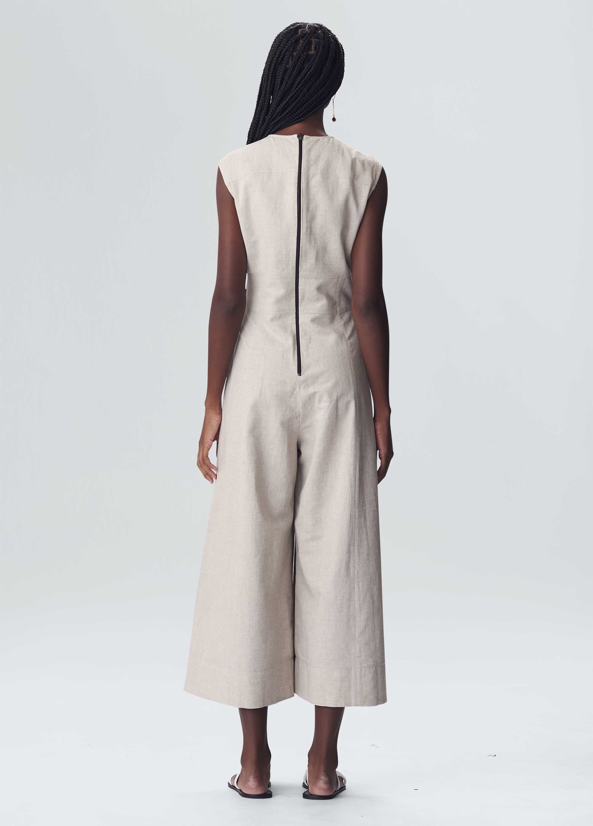 Macacão feminino, double face, cropped , acinturado com recortes inspirados em corsellet que valorizam o corpo no top que valoriza o busto e calça pantalona em linho com viscose.