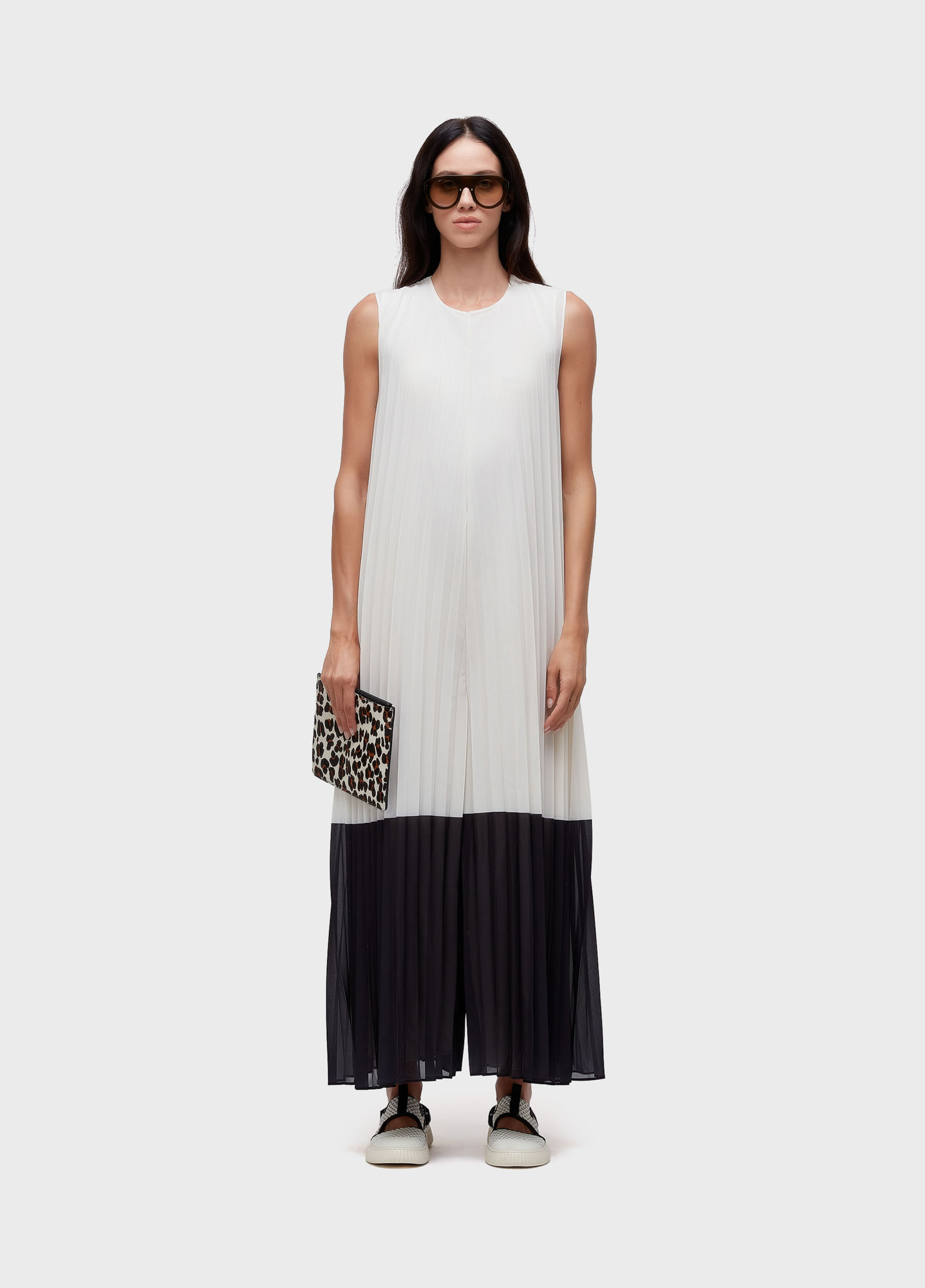 Macacão feminino, crepe, sleeveless, color block bicolor, plissado leque. Acompanha macacão sleeveless combinação de crepe