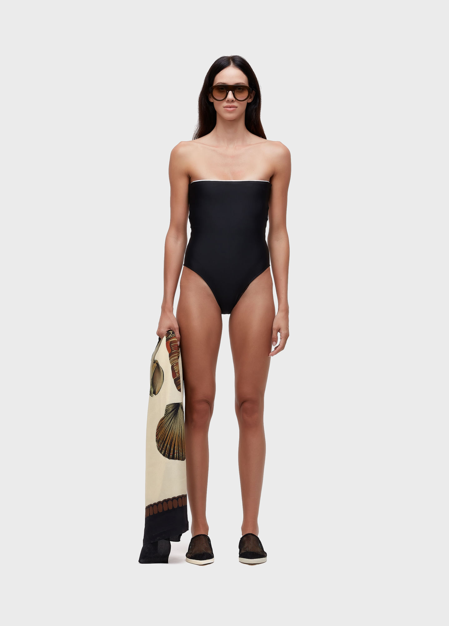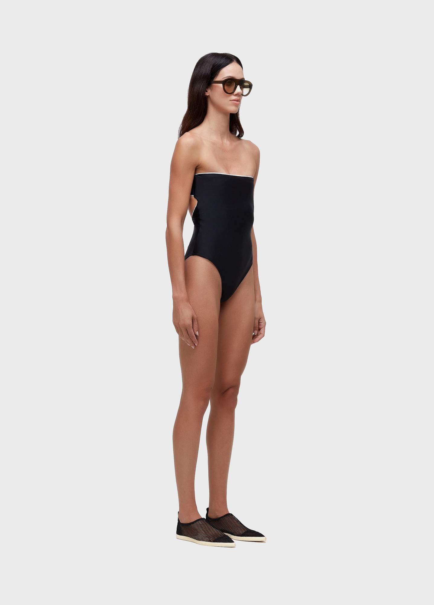 Maiô em modelagem bandeau, na cor preta, com friso no decote e cintura. Cor contrastante no decote, em branco. Bojo removível. Forro em malha elástica leve.