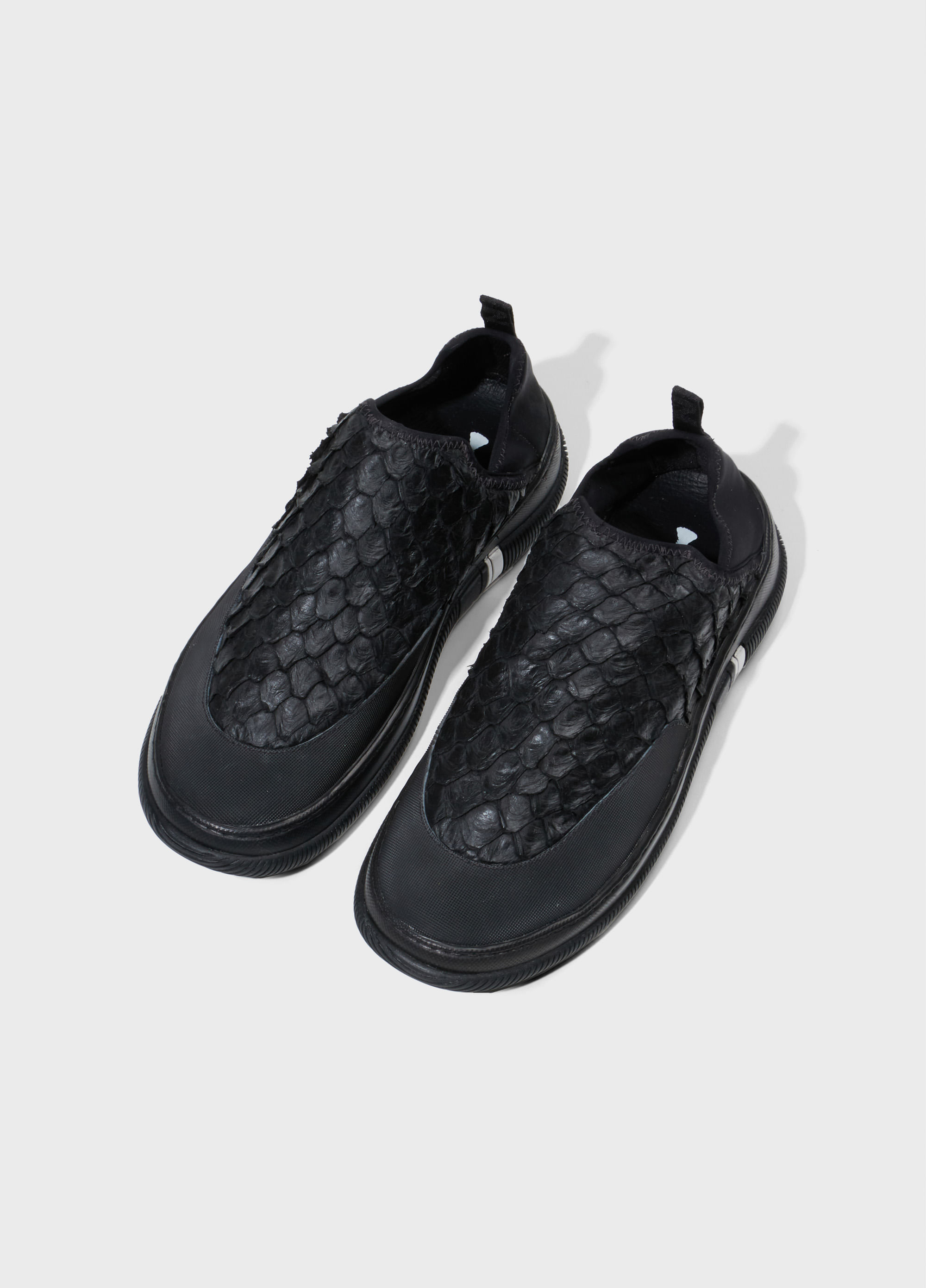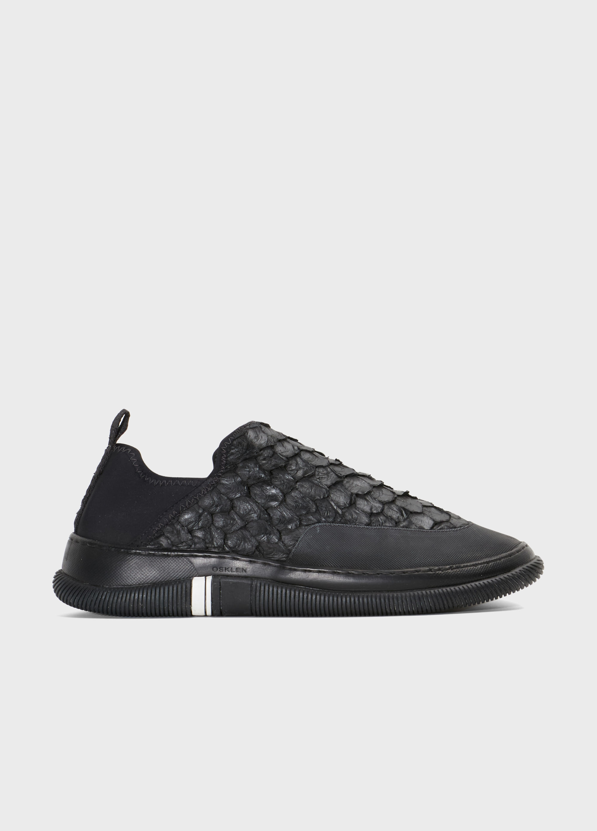 Tênis Hybrid em couro de pirarucu, modelo slip-on com recortes em borracha e traseiro em material elástico. Fita com arte personalida Osklen no traseiro. Forro e palmilha em couro bovino. Solado de EVA e borracha costurado ao cabedal com design exclusivo Osklen, produzido com no mínimo 10% de material reciclado. Produto Re-Design Waste.