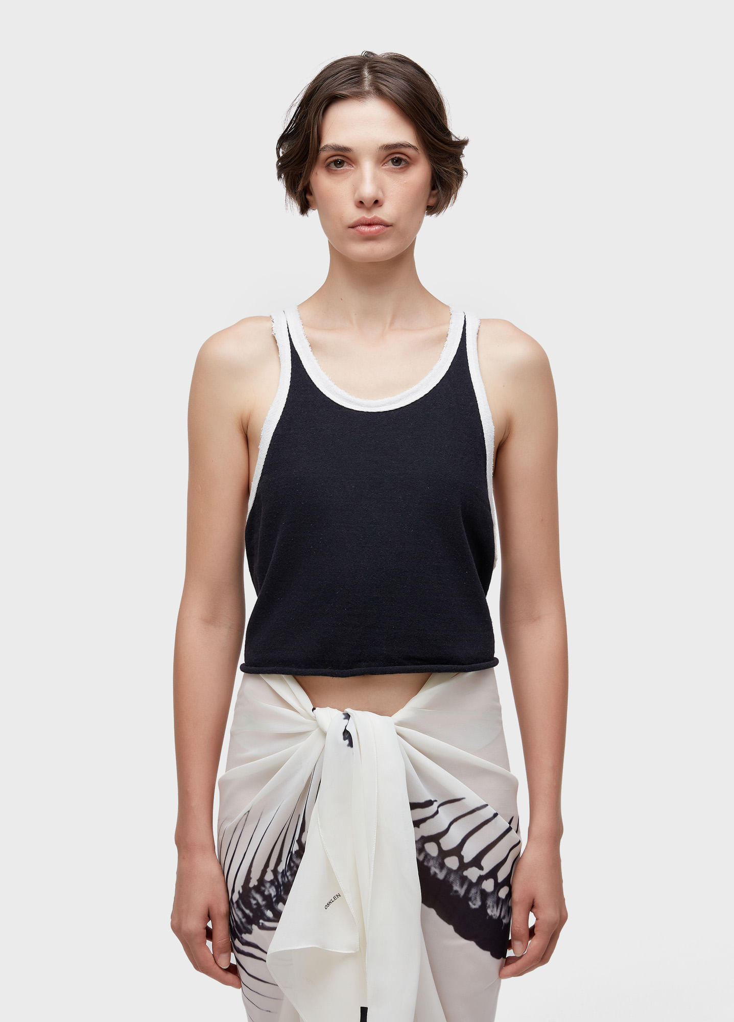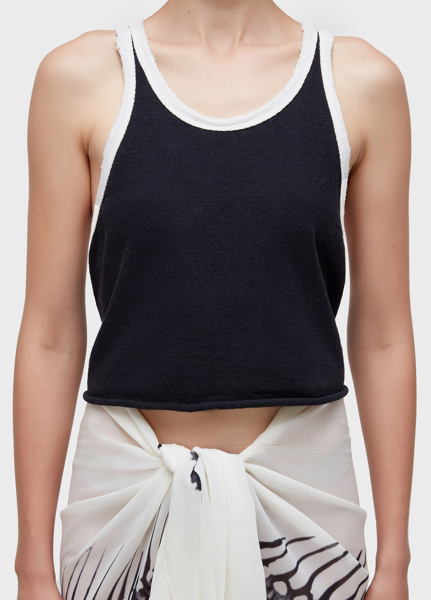 Regata com decote nadador e barra. Modealgem cropped; feita em malhão com fibras recicladas; Acabamentos desfiados; peça amaciada com Menta Orgânica; Bandeira RW - Recycle Fibres + Organic Mint Wash.