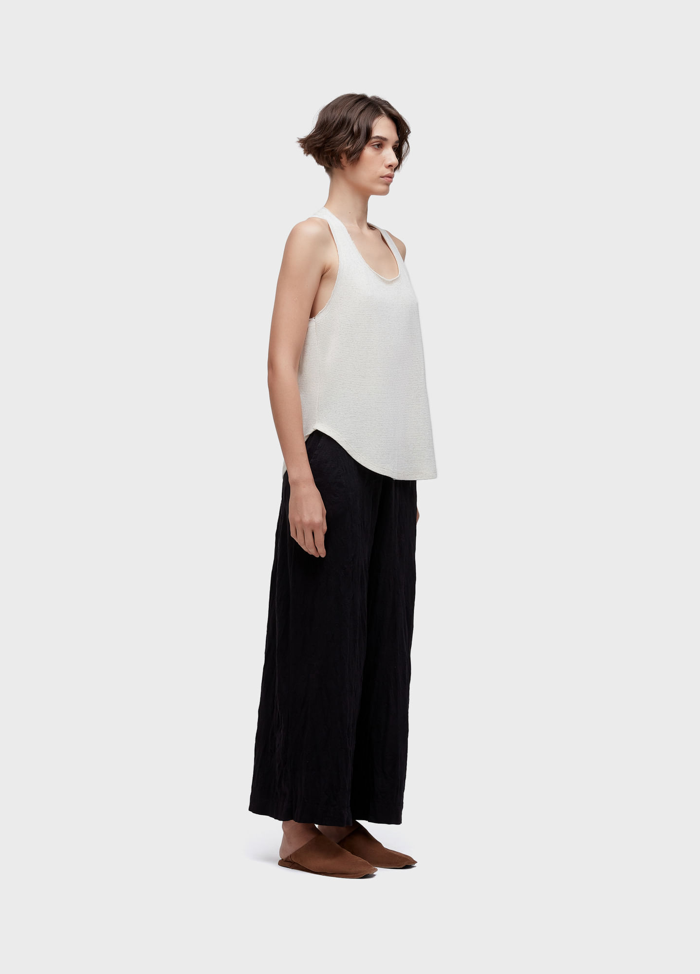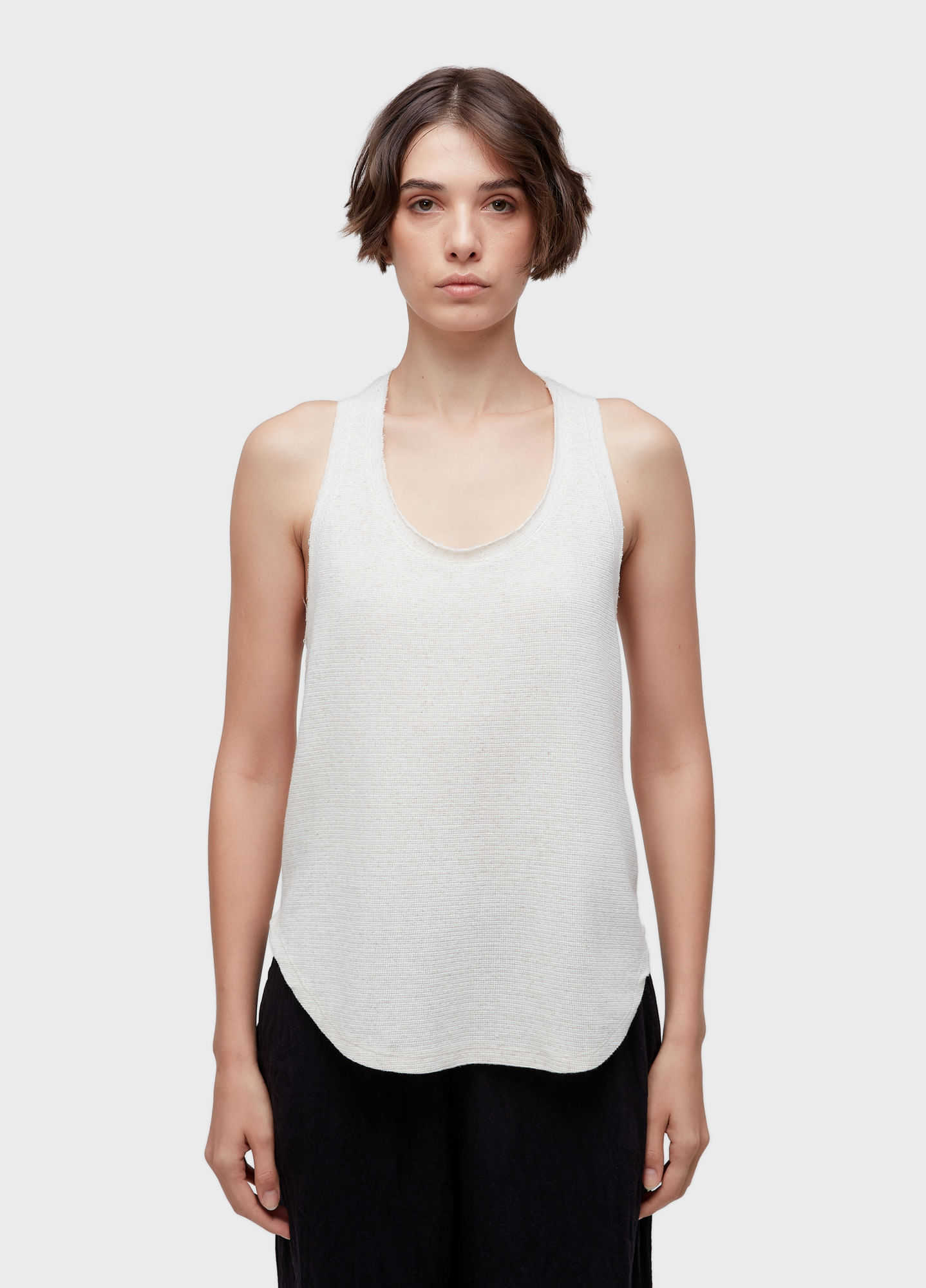REGATA COM DECOTE NADADOR FEITA EM MALHÃO COM JUTA; MODELAGEM OVER E BARRA LEVEMENTE FRALDADA; GALÃO LONGBOARD APLICADO NAS COSTAS. BANDEIRA RP: JUTA DA AMAZÔNIA