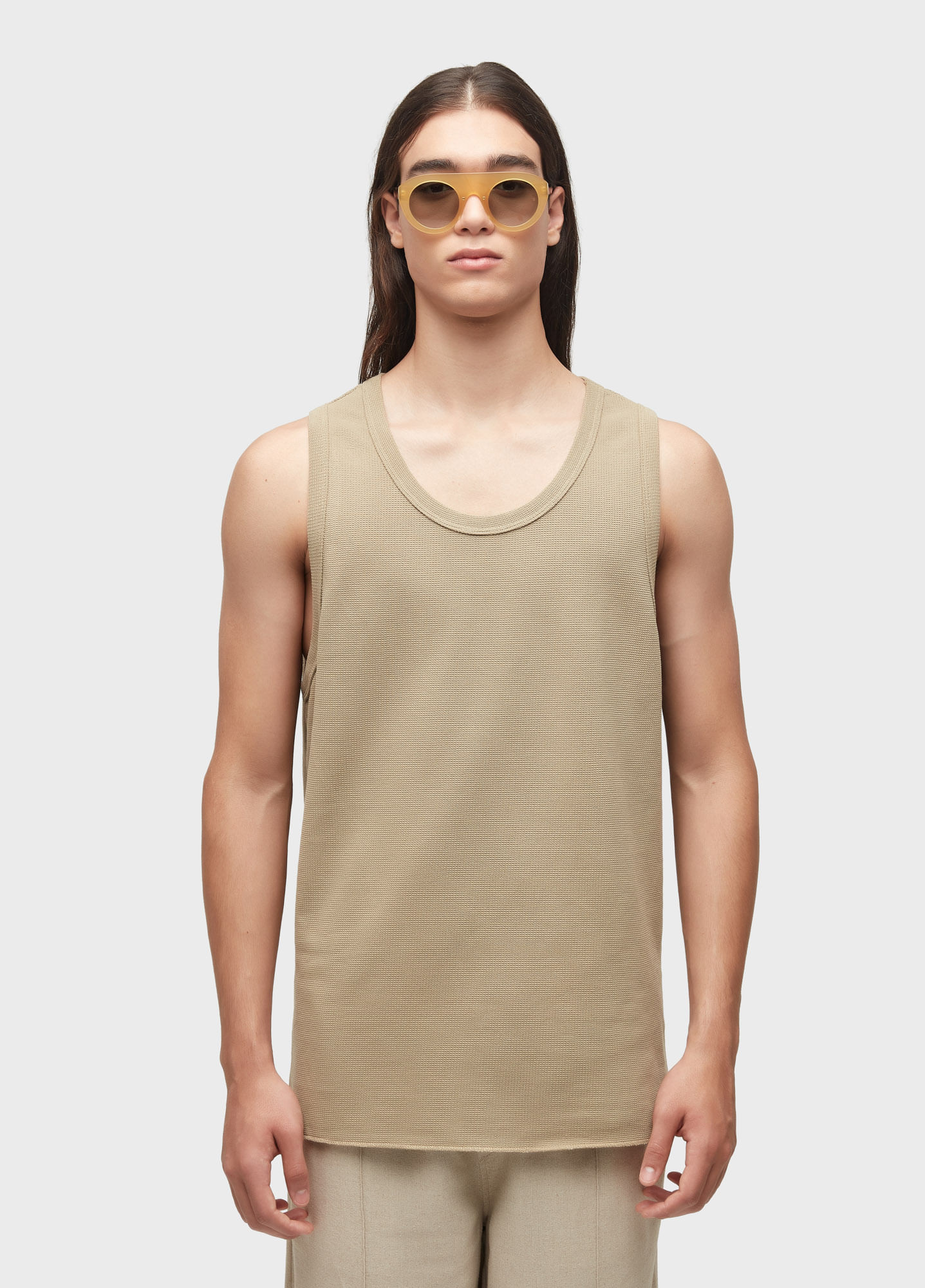 Regata masculina em malha texturizada 100% algodão. A peça possui amaciamento Organic Mint Wash, um processo natural formulado à base do óleo essencial da menta orgânica, cultivada em pequenas hortas que fazem parte de um projeto social que promove a recuperação e ressocialização de dependentes químicos. Bandeira: Respect our People.