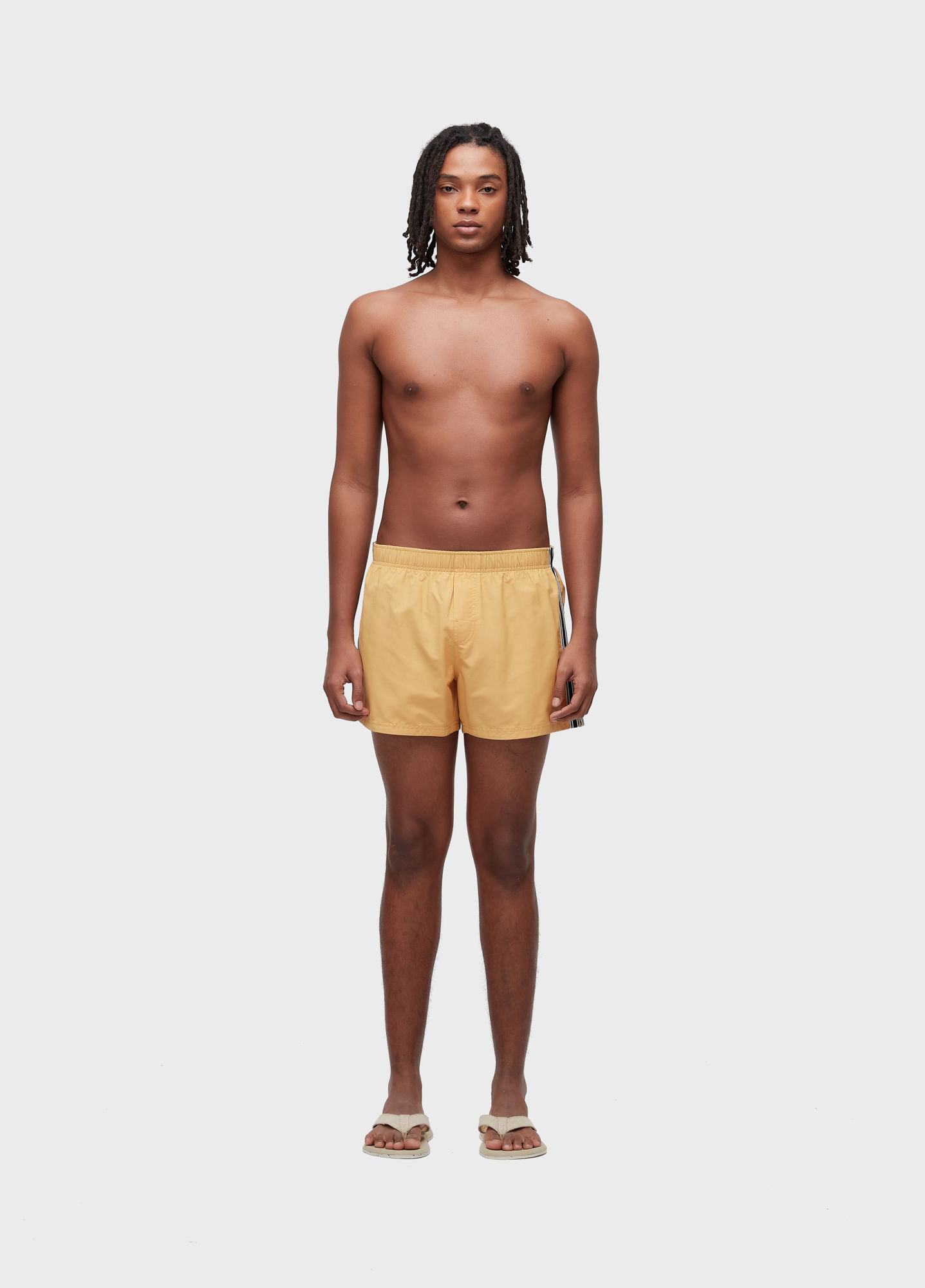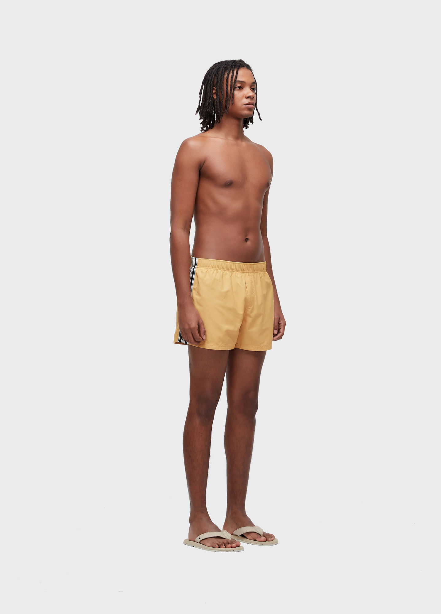 Short com cós de elástico masculino em tecido algodão com poliamida Ripstop. Modelagem Resort com lateral 13,5". Peça com fita aplicada nas laterais.
