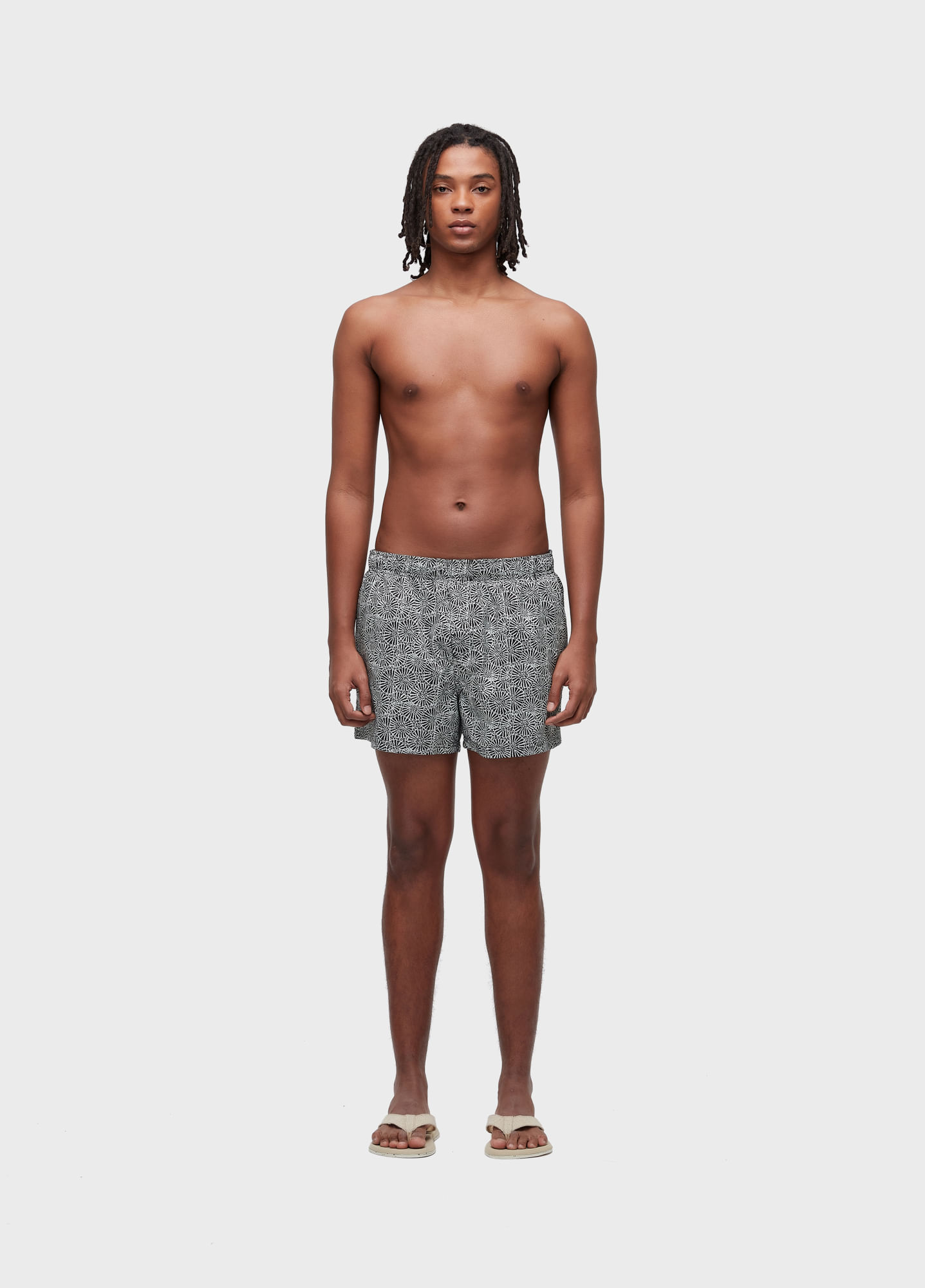 Short com cós de elástico masculino em tecido Aquaflex. Modelagem Resort com lateral 13,5". Estampa Vintage Coral. Secagem Rápida.